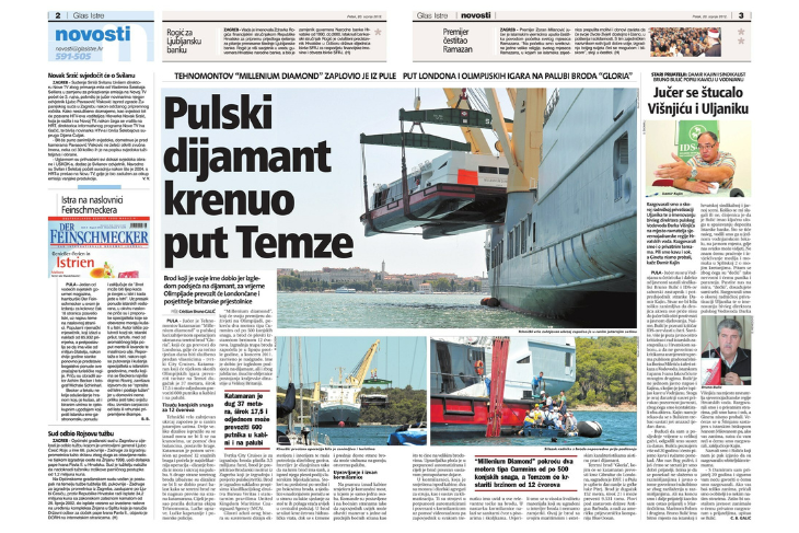 Detaljno su novinari izvještavali o pomorsko-tehničkoj operaciji u pulskoj luci - ukrcaj Tehnomontovog katamarana "Millenium Diamond" na teretni brod "Gloria". Katamaran, specijalno izrađen za londonsku tvrtku City Cruises. Već tjedan dana kasnije, u jeku Olimpijskih igara u Londonu, trebao je prevoziti tisuće posjetitelja britanske prijestolnice Temzom, nudeći im panoramski pogled na znamenitosti grada s tog jedinstvenog plovila. Tvrtka City Cruises je za izgradnju broda, pisalo se, platila 3,5 milijuna funti, brod je projektirao Brodarski institut iz Zagreba koji je izgradnju i povjerio pulskoj tvrtki.