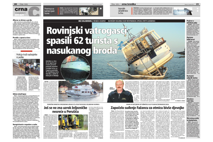 Još jedna vijest o brodu, no ovog puta u negativnom kontekstu, našla se također na stranicama novina - na Crnoj kronici. Izvještavalo se o pomorskoj nesreći od dvije noći ranije, kada se, nešto prije 23 sata, izletnički brod "Kuba" s 60-ak turista nasukao u plićaku kod otoka Sv. Katarina. Situacija je zahtijevala brzu i koordiniranu intervenciju. Prvi je na pomoć stigao brod "Maskin" hotelske kuće Maistra, no zbog pličine nije mogao prići nasukanom brodu. U pomoć su stigli i rovinjski vatrogasci, koji su u akciji spašavanja sudjelovali s vatrogasnim gliserom i gumenim čamcem. Putnici su uspješno prebačeni na "Maskin", a potom u obližnja turistička naselja. Akcija spašavanja protekla je bez panike, a u moru nije zabilježeno onečišćenje zahvaljujući brzom postavljanju zaštitnih brana. Prema tadašnjim pretpostavkama nadležnih, uzrok nesreće bila je pogreška kapetana, budući da je tih dana (i noći) bilo mirno more.