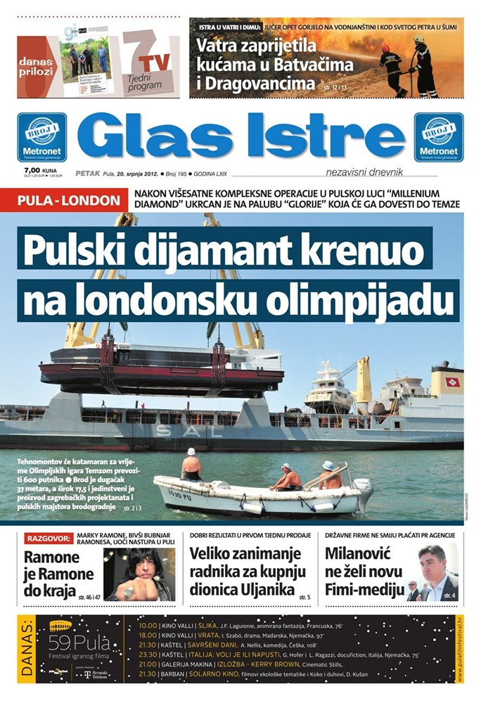 Prije točno 13 godina na današnji dan, Istra je živjela dinamično ljeto ispunjeno vijestima s mora, s požarišta i s kulturnih pozornica. U Puli se tada odvijala zahtjevna operacija ukrcaja broda "Millenium Diamond" koji će se upisati u povijest istarskog brodogradilišta Tehnomont. Vijest da će katamaran koji je svoje ime dobio jer izgledom podsjeća na dijamant, za vrijeme Olimpijade prevoziti Londončane i posjetitelje britanske prijestolnice, bila je glavna vijest Glasa Istre tog dana.