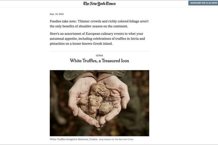 Ugledni američki The New York Times Istru je uvrstio u top izbor regija s najzanimljivijim jesenskim gastronomskim festivalima u Europi, s posebnim fokusom na sezonu bijelog tartufa u Istri.