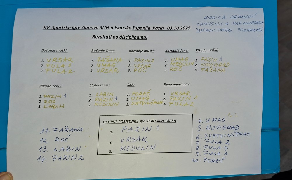 Prvo mjesto osvojili su članovi Podružnice Pazin, drugo Podružnice Vrsar, a treće Podružnice Medulin. Pokazalo se kao i u svih četrnaest susreta do sada da je još važnije od sportskih rezultata promicanje aktivnog života, zdravlja i zajedništva, pa upravo zato važi slogan njihove udruge "Zajedno smo jači!".