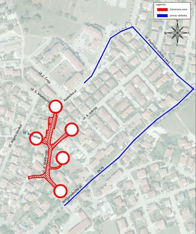Radovi će biti izvedeni u jednoj fazi, tijekom koje će zona zahvata biti zatvorena za sav promet, osim za vozila gradilišta i stanara na dijelovima gdje se ne izvode iskopi oborinskog kolektora. Zona radova protezat će se Ulicom Giuseppine Martinuzzi i njezinim ograncima, od raskrižja s državnom cestom DC75 – Zemljoradničkom ulicom, pa sve do raskrižja s Radničkom ulicom. Obilazni pravci u oba smjera bit će osigurani preko Zemljoradničke ulice, Ulice Pazinskih odluka 1943. te Radničke ulice. Ulica 6. svibnja za vrijeme radova postaje slijepa, a znakovi privremene regulacije bit će postavljeni na svim ključnim lokacijama kako bi promet na tom području bio što protočniji.