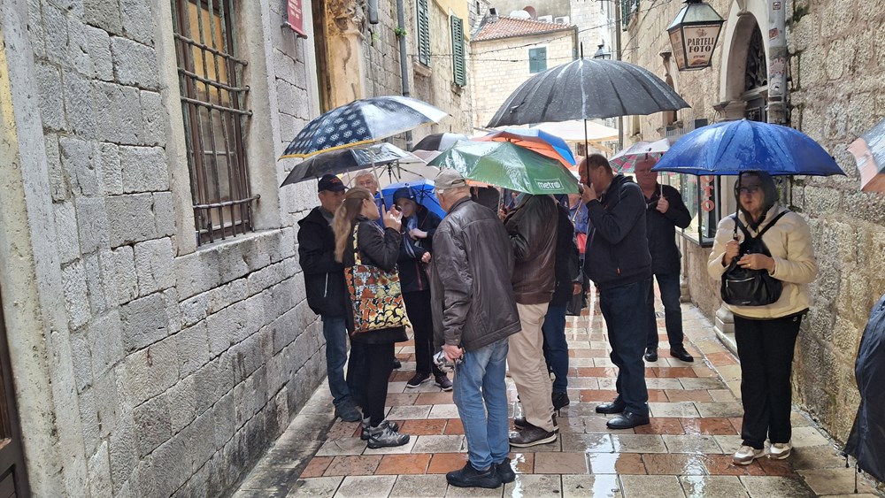 Za treći dan predviđen je posjet Bokokotorskog zaljeva i grada Kotora. Najprije se autobus zaustavio u Perastu, a putnici su prevezeni brodom na otočić sa zavjetnom crkvom Gospe od Škrpjela. Ovaj umjetno stvoreni otočić interesantan je, jer svake godine stanovnici Perasta napune svoje barke kamenjem i dolaze na otok. Obiđu oko otoka te izbace kamenje u more. Na taj se način održava otočić. Još interesantnija je crkva sa najvećom zbirkom zavjetnih pločica na svijetu. Obilazak je nastavljen posjetom starog dijela grada Kotora, poznatog po impresivnoj arhitekturi i brojnim spomenicima. Iako je kiša ometala razgledavanje grada uz veliki trud vodičkinja obiđen je grad i posječena katedrala Sv. Tripuna.