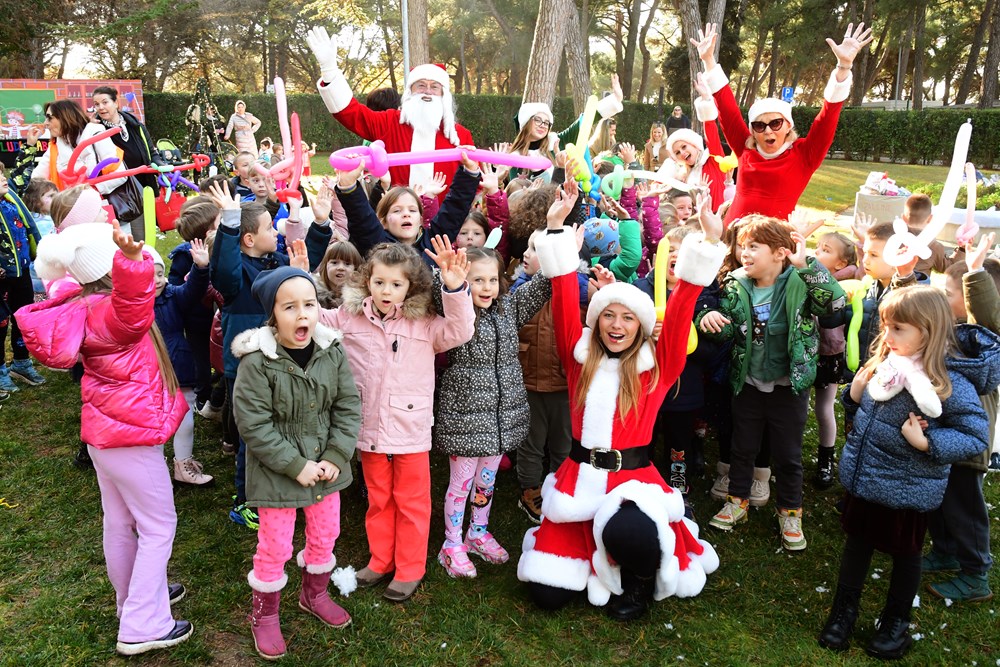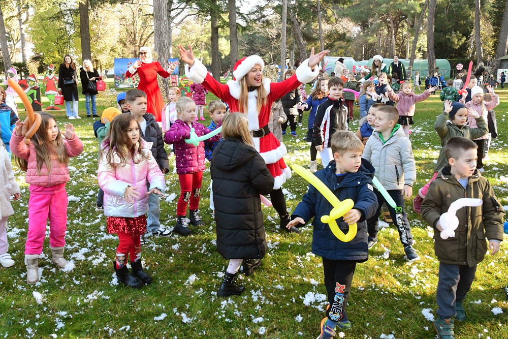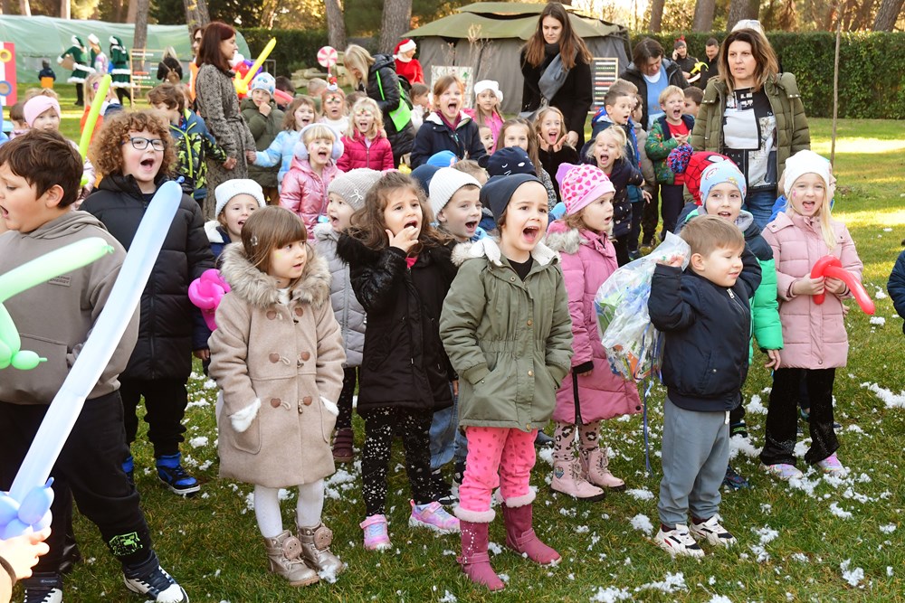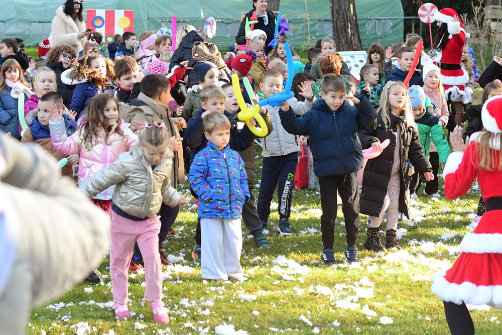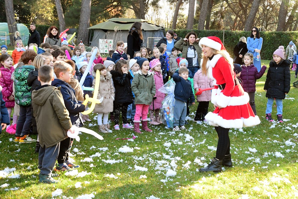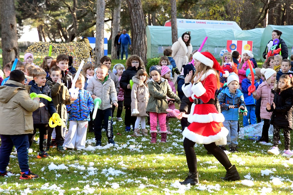 Sunčano jutro u fažanskoj rezidenciji Djeda Mraza bilo je prepuno zabavnih sadržaja za mališane - pa su tako imali i potragu za snježnim kuglama, da pomognu medvjediću sa Sjevernog pola da se osvježi, a bilo je to i plesa i pjevanja pjesmica. Djed Mraz je svakom od 260 mališana osobno uručio poklon, a otkrio nam je i što su ga najčešće pitali - je li mu to prava brada.