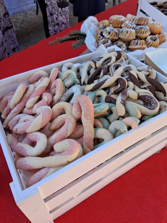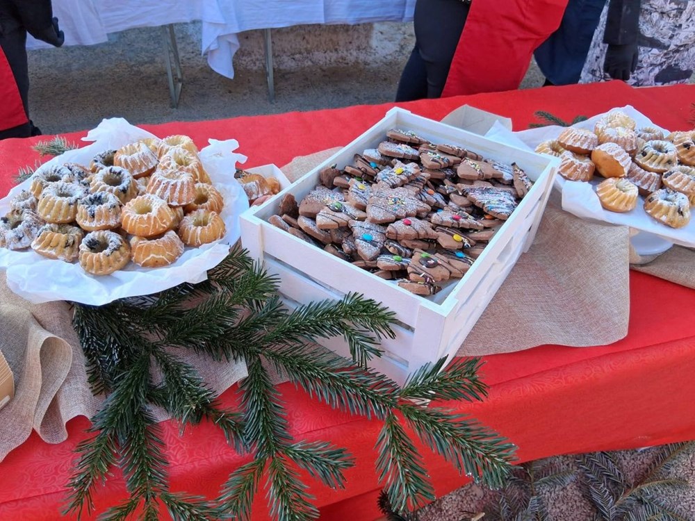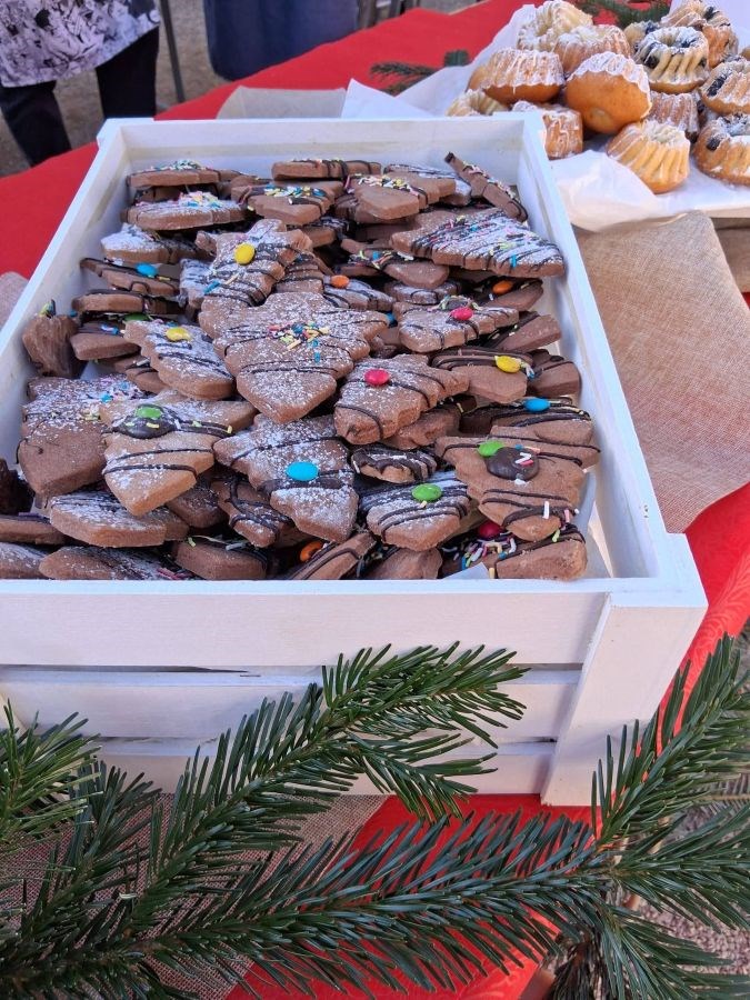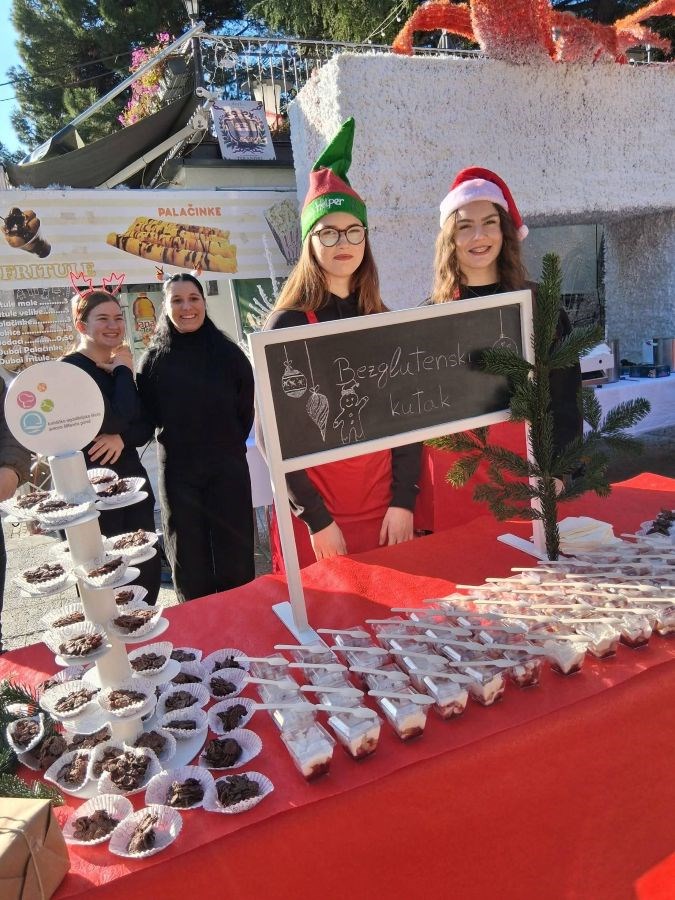 Učenici su uz vodstvo mentora pripremili tisuće slasnih fritula, kuglofa, raznih keksa od prhkog tijesta sa božićnim motivima, čokoladne fontane s bijelom i crnom čokoladom, a bio je tu i bezglutenski kutak: tiramisu u čašici s malinom, čokoladni štapići…sve je nestalo u trenu.