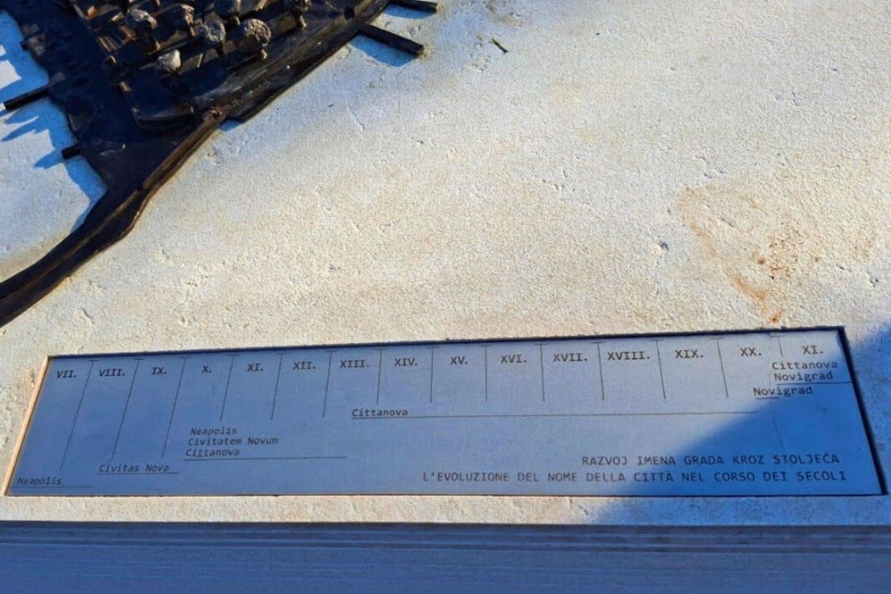 Za maketu je posebno dizajniran postament u obliku kubusa (150 cm × 150 cm, visine 65 cm), čije su bočne stranice oblikovane kao stilizirana lenta vremena koja kroz slojevitu strukturu prikazuje bogatu povijest Novigrada-Cittanova, od rimskih temelja do suvremenog urbanog tkiva, prikazanog kao završni sloj u formi brončanog odljeva. Maketa je dovršena na ljeto 2025.godine te predana tvrtki Ljevaonica umjetnina d.o.o. na postupak lijevanja i završne obrade. Po završetku lijevanja svi su objekti postavljeni na odgovarajuće pozicije, a maketa je dodatno patinirana.