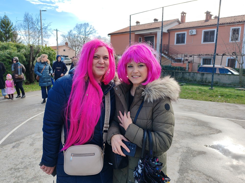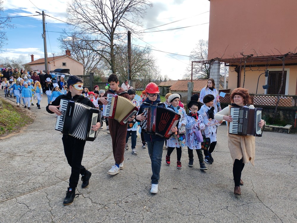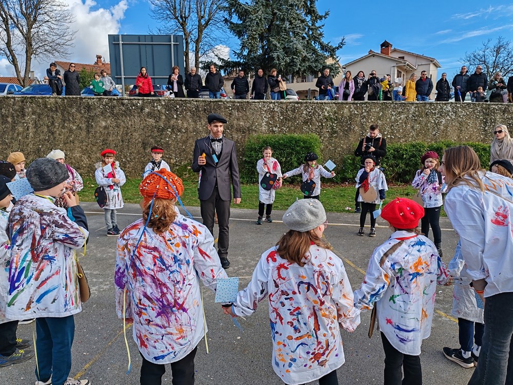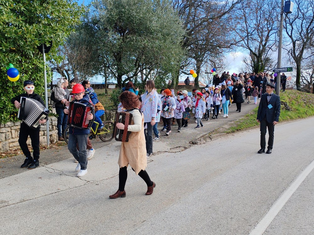 Program najbučnije povorke i zabave započeo je okupljanjem u 14.00 sati na nogometnom igralištu u Nedešćini, a zatim je povorka maškara, u kojoj su sudjelovali učenici nižih razreda osnovne škole iz Nedešćine maskirani u slikare i štrumfove, u pratnji roditelja prošla kroz mjesto. Bilo je tu i nekoliko individualnih maškara, malih i velikih – od male djece i "pinky" mamica do Crvenkapice s bakom, vukom i malim lovcem, arlekina i drugih.