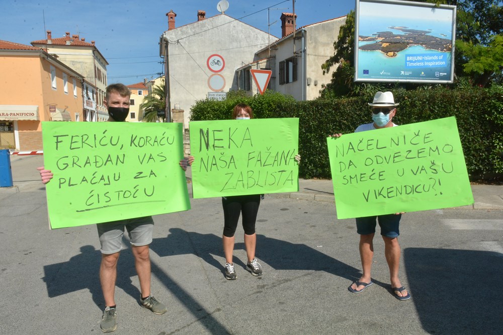 "Neka naša Fažana zablista", "Načelniče, da odvezemo smeće u vašu vikendicu?", "Feriću, pusti Kaštijun, očistimo Fažanu" i "Feriću, Koraću, građani vas plaćaju za čistoću" - pisalo je na transparentima koje su nosili, a očigledna poruka je da šef fažanskog Komunalca Danijel Ferić, koji često kritizira politiku odlaganja smeća na Kaštijunu, istovremeno u "svom dvorištu" ima velike probleme s otpadom.