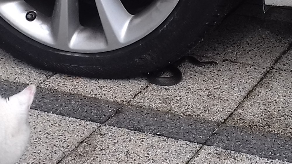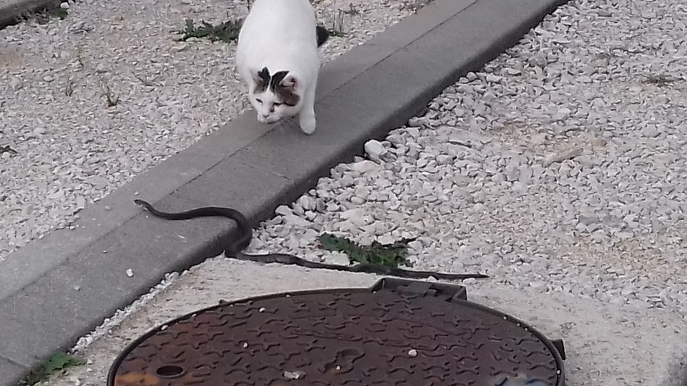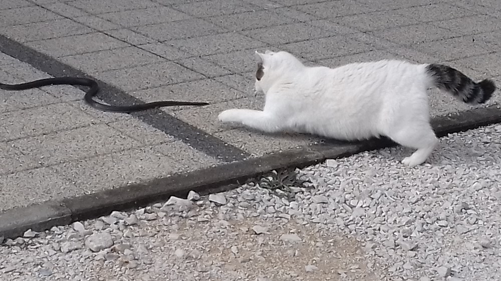 No ovog je vikenda imala pravi okršaj sa zmijom koja je umjesto do nekog „zimskog doma“ domilila do zgrada i skrila se vješto iza kotača automobila na parkiralištu ispred zgrade. Koji joj je bio sljedeći plan, vrag bi ga znao?! Krafna ju je prva uočila i mijaukanjem privukla pozornost neugodno iznenađenog vlasnika vozila. Onda se odvažila i s instiktivnom dozom opreza ustremila prema zmiji. Zmija je zasiktala, ali ju je Krafna s pristojne udaljenosti najurila i nastavila vrebati, vjerojatno prirodno gonjena mačjom znatiželjom, ali i spoznajom o svojim predatorskim limitima. U drugom je kadru zmija vješto izmigoljila, dok je Krafana uporno pratila njezin radijus kretanja. U trećem je kadru Krafna opet netremice fiksirala zbunjenu zmiju, a onda joj nastojala skočiti na rep, ali nažalost ,ova „puzavica“ je bila brža i uvukla se strelovitom brzinom u auspuh drugog automobila parkiranog ispred zgrade. Kakav peh za Krafnu, ali i vlasnika. Dok se ne upali motor i automobil ne pokrene ili zmija prikrade sama, Krafna je odlučila čekati svoj izgubljeni plijen dežuranjem ispod auta.