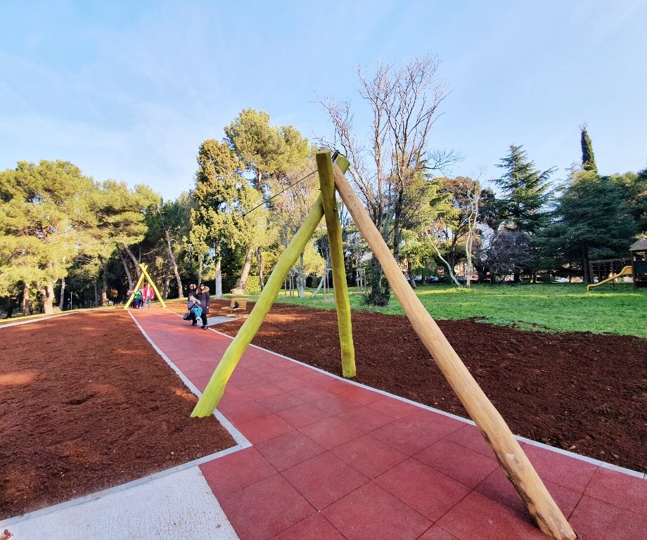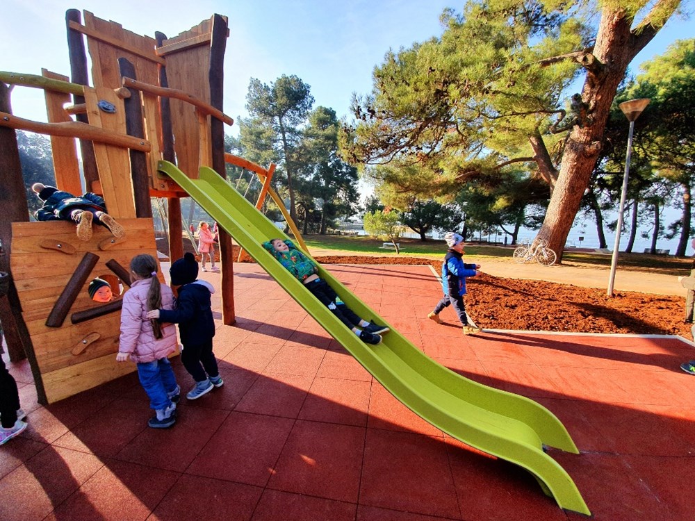 Zip-line, ljuljačke, tobogani, drvene kućice, gljive za preskakanje, klackalice, antitraumatska gumena podloga… Sve je to samo dio igrala postavljenih na novouređenom, modernom dječjem igralištu na Gradskom kupalištu u Poreču.