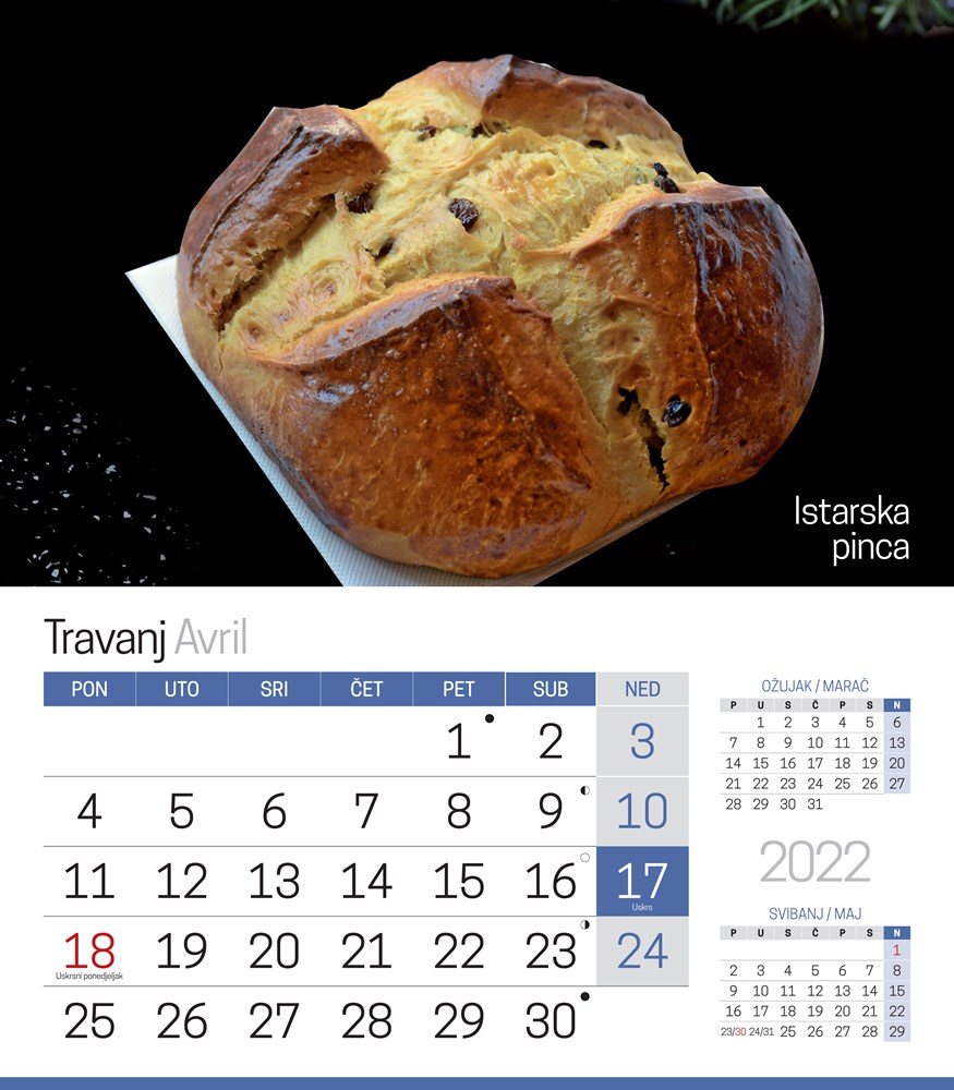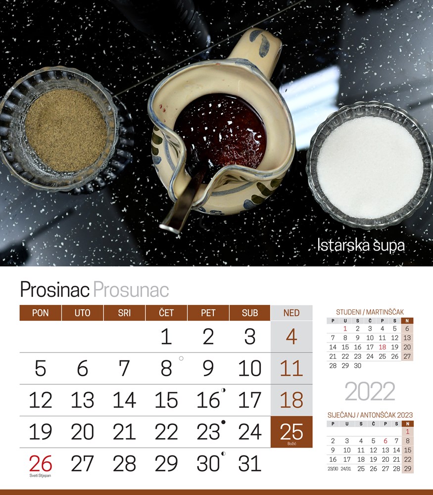 Ove srijede, 8. prosinca u vašem primjerku Glasa Istre pronaći ćete kalendar na dar. Na 13 stranica fotografijama smo predstavili neke od tradicionalnih, istarskih slastica, a na podložnom kartonu i osnovnu recepturu za njihovu izradu.