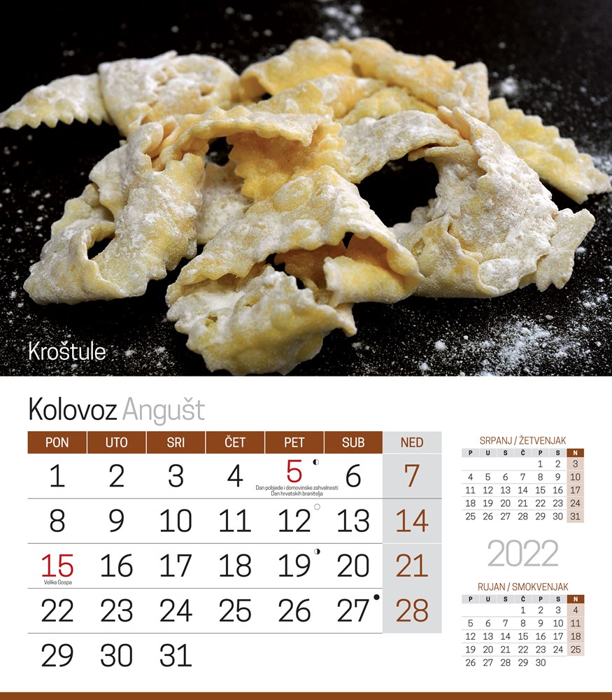Hrskave i slasne kroštule svako su morale pronaći svoje mjesto u našem kalendaru i to u mjesecu kolovozu. Pripremane su i za vrijeme karnevala, a recepata za izradu ima mnogo. Razlike su u nijansama, a vi isprobajte i onaj koji vam donosimo na podložnom kartonu.