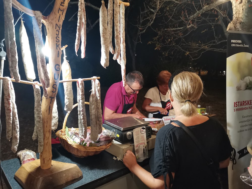 Bivši gradonačelnik Pazina Veljko Krulčić sa sinom je nudio proizvode svoje destilerije a ponudu je obogatio i Milan Udovičić iz Žminja sa suhomesnatim proizvodima iz svoje tvrtke Žminjski gušti.