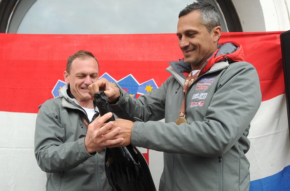 S medaljama koje se dodjeljuju svim ekipama koje su okončale utrku, Danijel Šaškin i suvozač Saša Bitterman stali su na binu s bocom šampanjca i odradili ritualno tuširanje. Uz Danijela i Sašu bili su tu i Darko Pehljan te Marin Frčko, odnosno sveprisutni mehaničar i savjetnik (slovenski vozač bio je i sam vozač jednog izdanja Dakra, op.n.) te graditelj-mađioničar financijske konstrukcije cijelog projekta.