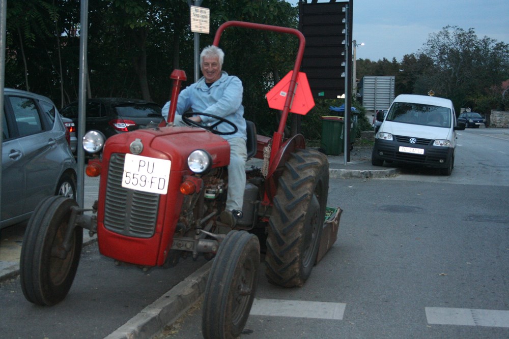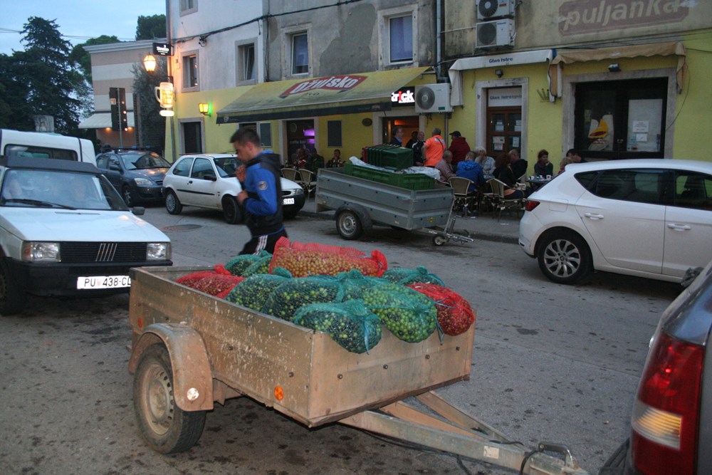 U koloni vozila ističe se i nekoliko traktora koji vuku kašete s maslinama. Na jednom od njih zavalio se, kao da drijema, Dinko Čikada iz Vodnjana. No, nije se uspavao, budno pazi na red, a otkriva ga smiješak dok ga fotografiramo. (Napisao i snimio Zvjezdan STRAHINJA)