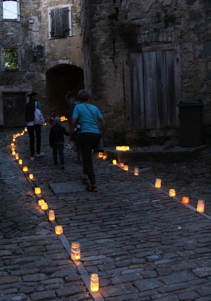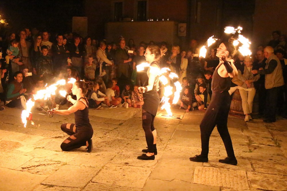 Kad se spustio mrak svi su krenuli na trg kod crkve, stazama osvijetljenim lampionima, stotinama staklenki u kojima su gorjele svijeće, rad učenika oprtaljske škole u produženom boravku. Na velikom trgu zapaljen je veliki krijes kao podsjetnik na nekadašnju tradiciju. Nekoliko manjih krjesova preskakali su najmlađi, a kad se vatra stišala brojnim posjetiteljima predstavila se žonglerska skupina Red Rays iz Rijeke s mnogim gorućim rekvizitima.