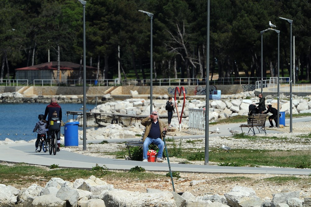 Restiktivne mjere zaustavile su niz aktivnosti, kako poslovnih tako i onih privatnih, no Porečani nisu izgubili "duh" - šeta se, vozi se bicikl, počela su i prva sunčanja na plaži, a nije posve nestala ni poslovna aktivnost pa su tako i tijekom subote nastavljeni radovi na porečkoj rivi.