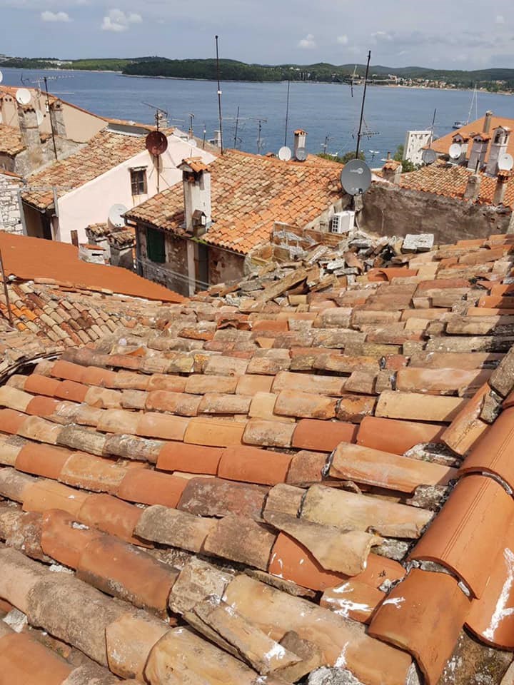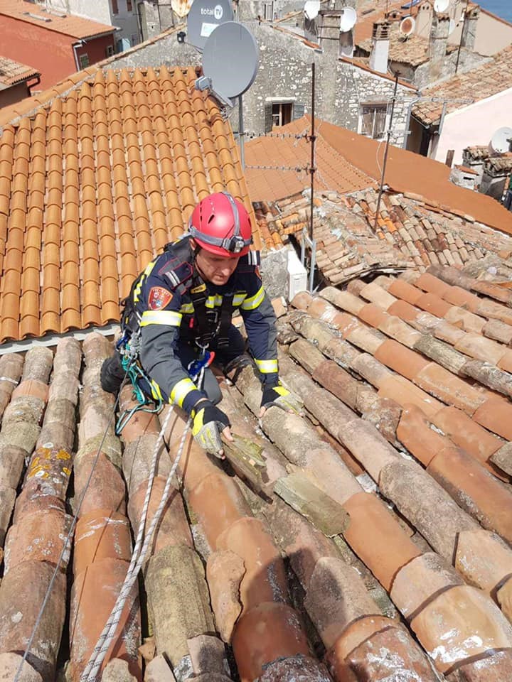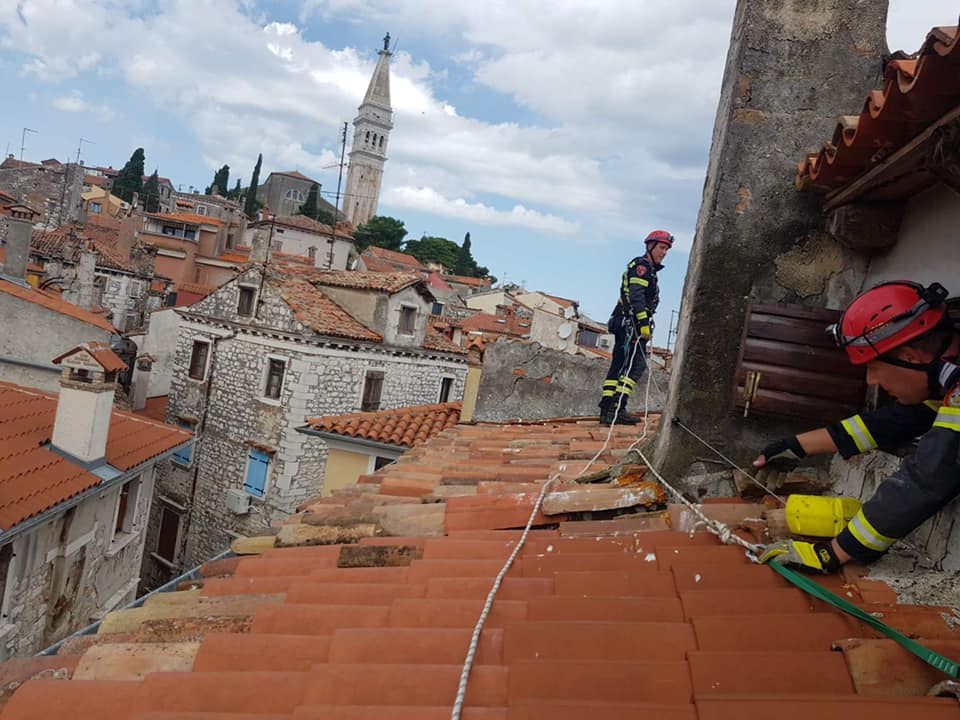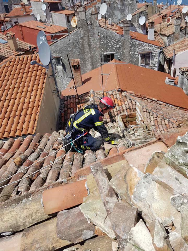 A danas su pak vatrogasci Javne vatrogasne postrojbe Rovinj - Rovigno imali pomalo nesvakidašnju akciju - popeli su se na rovinjske krovove, gdje su uklonili oštećeni dimnjak, koji je prijetio da padne na prolaznike.