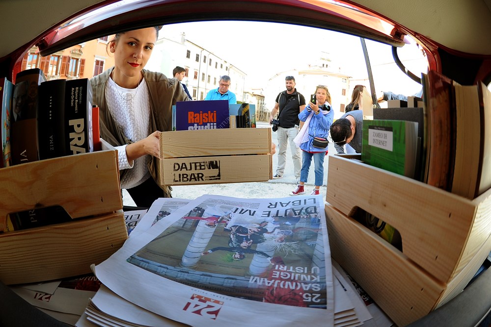 Uz istoimenu sajamsku himnu, karavana "Dajte mi libar" jučer se točno u podne, predvođena starim crvenim 'Renaultom 4', čiji je prtljažnik bio pun knjiga, zaustavila na Narodnom trgu u središtu Vodnjana. U lokalnom kafiću "Al Fondaco" djelatnici sajma postavili su par kutija knjiga, koje su potom razgledavali mještani. Svi zainteresirani mogu ih besplatno posuditi, pročitati i vratiti na isto mjesto, a isto tako mogu u ovu 'free mini javnu knjižnicu' donijeti i neke svoje knjige.