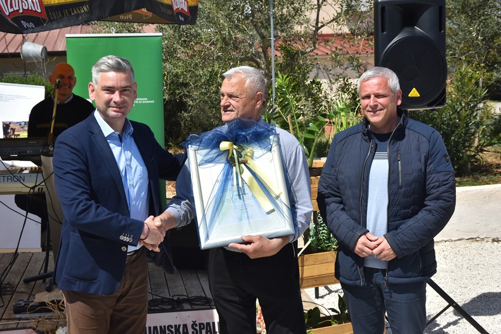 Poznati pršutar Milan Buršić, koji zajedno sa svojom velikom i složnom obitelji organizira godinama ovu manifestaciju na uskršnji ponedjeljak danas je primio i posebno priznanje zahvale od župana Borisa Miletića.