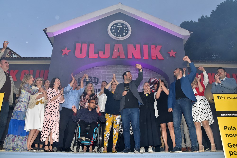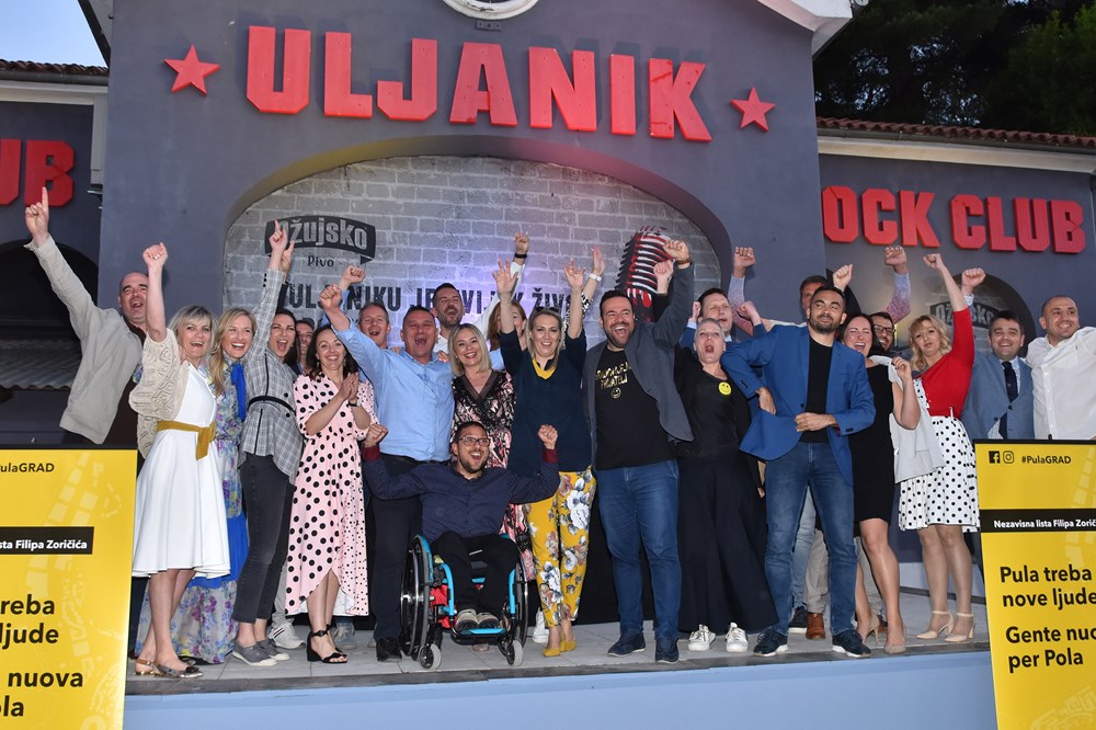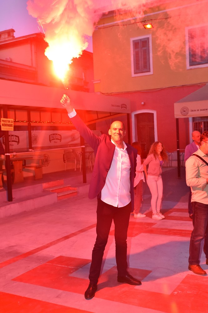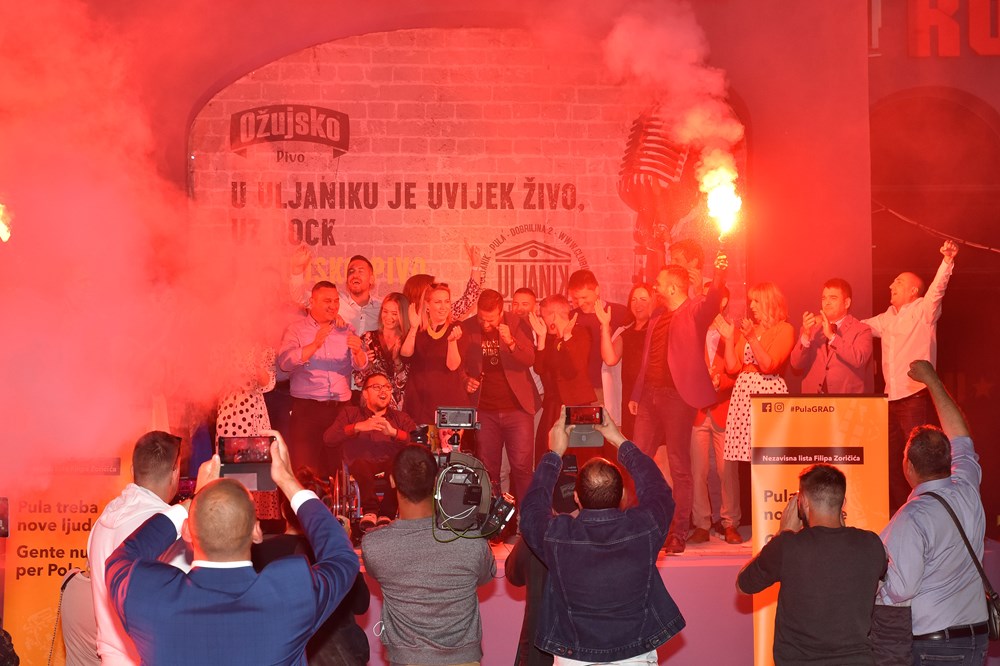 U taboru Filipa Zoričića u Klubu Uljanik je jako veselo. Zapaljene su i baklje, a došao mu je čestitati i Danijel Ferić (SDP) koji je za ušicu igle izgubio izbore za župana.