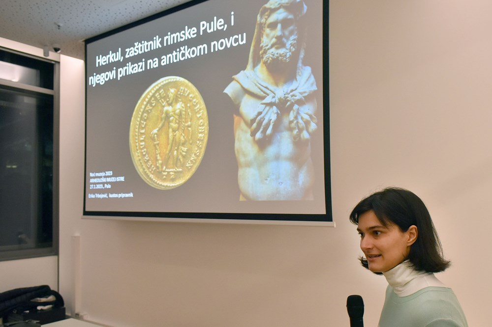 Zanimljiva su bila i predavanja, prvo naslovljeno "Herkul, zaštitnik rimske Pule i njegovi prikazi na antičkom novcu", upriličila je uz obilje komparativnih primjera Erika Trbojević, kustosica pripravnica u Arheološkom muzeju Istre u polivalentnoj dvorani obnovljenog Arheološkog muzeja Istre.