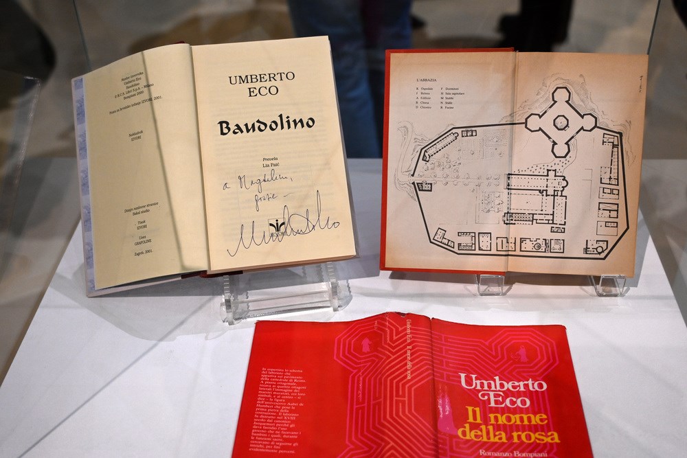 Manara je istaknuo da su tu izložene, u centralnom dijelu galerije, originalne crno-bijele table prvog toma njegove verzije čuvenog Ecovog romana "Ime ruže", popraćene reprodukcijama u boji. Kazao je da se nada da nema grešaka, odnosno da se ne vide, te dočarao posjetiteljima ukratko postupak nastanka ovoga djela, odnosno ovih tabli, originalnih crno-bijelih, a kazao je da to kasnije, prije tiska, sredi njegova kćerka Simona.