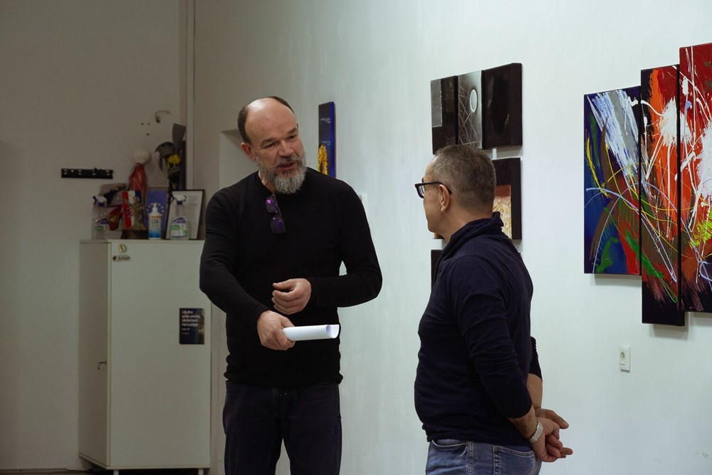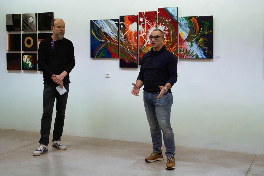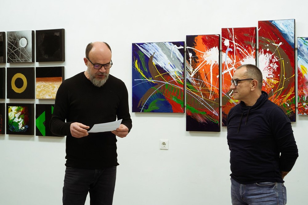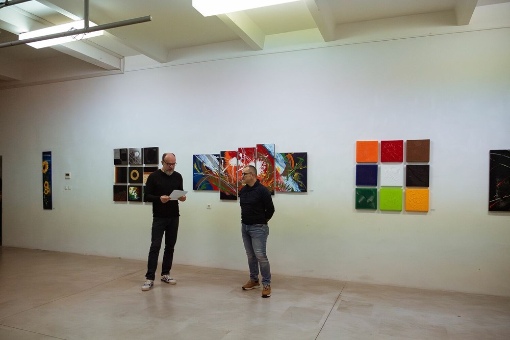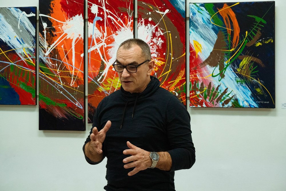 - Bez osobnih okova zarobljenih u tvrdim odrednicama klasičnih smjerova, Davor Hlatkij dopušta si slobodu eksperimentiranja kroz bogate nijanse akrilnih boja smještajući ih na zavodljive površine platna, drva i gipsanih ploča. Autor svjesno kroči putem apstrakcije, istražujući njemu tri ključna smjera; onaj geometrijski, strukturni i potom pejzažni. Svaki potez kista, svaka linija na platnu, nosi sa sobom duboko ukorijenjen smisao, isprepletajući se u harmoniju koja poziva posmatrača na intelektualno i emocionalno putovanje. Boje postaju jezik kojim autor izražava svoju ekspresiju, stvarajući ritam i dinamiku nekad poznatih, a često i tajanstvenih struktura, kazao je Štifanić.