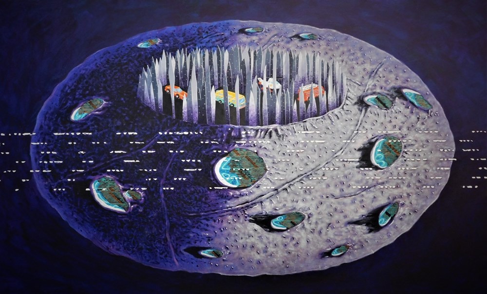 - Ako malo pažljivije pogledate te radove, vidjet ćete kojom je to perfekcijom rađeno, tako da oni više djeluju kao objekti, nego kao slike da ti gledate objekte iz daleka. To je plasticizam koji levitira između druge i treće dimenzije i koji svojom strukturom, svojim kolorizmom daje snažan dojam da je perfekcionistički napravljeno i interpretacijski vrlo, vrlo zrelo. To je priča o planeti za koju se ne zna kako je nastala, to je jedan od Saturnovih satelita, taj Japet, jedan od satelita koji ima prsten po sredini samo što je istaknut u njegovom reljefu i ima taj jedan šesterokutni krater potpuno pravilan tako da postoji i teorija da su ga radile neke druge civilizacije.