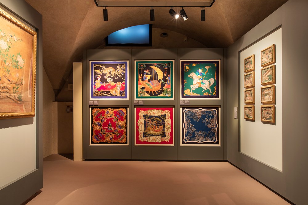 Na zidovima sala prikazani su počeci dolazaka svile u Europu ("Put svile"), zemljopisne karte trgovaca, putnika i misionara, a potom i kasnije likovne inspiracije razasute po dragocjenim oslikanim albumima iz firentinskih arhiva. Taj dio izložbe zasebno je postavljen u samoj Sveučilišnoj knjižnici (Biblioteca Nazionale).