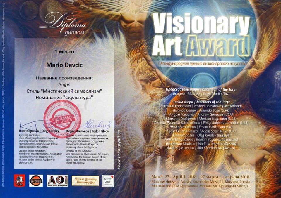- U Moskvi, točnije u Moscow House of Artist, sudjelovao sam 2018. godine na izložbi Visionary Art Award, koja je ujedno bila i natjecateljskog karaktera. Izložbu organizira Euroasian Art Union, Moskovska akademija te bečka akademija Visionary Arta, i tamo se predstavilo stotinjak umjetnika iz cijelog svijeta. Ovoga puta su uz nadrealizam bili predstavljeni i drugi pravci, te sam u kategoriji skulpture osvojio prvo mjesto. Značaj ove nagrade je tim veći što su u žiriju koji je ocjenjivao radove bili najznačajniji predstavnici visionary arta današnjice - između ostalih, tu su bili Andrew Gonzalez, Martina Hoffmann, Philip Rubino Jacobson - profesor na Akademiji u Parizu, Oleg Korolev koji je ujedno i pokretač izložbe te selektor radova, kao i profesor na akademiji Visionary Arta u Beču…