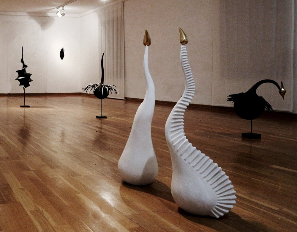 - Umjetnica nudi kolekciju neobičnih bića kojima naseljava prostor galerije. Radi se o objektima, predstavljenim kao likovne jedinice unutar izložene cjeline. Cijeli projekt možemo podijeliti na dvije grupe radova. Jednu grupu karakteriziraju začudne forme pticolikih bića. U manju grupu pripadaju oblici glava, uz ideju maske. Autorica nam sugerira ideju Svete ptice. Odnos mogućeg i bajkovitog umjetnica prelazi s lakoćom. Ona je čas u realnosti, čas u žaru maštarija. Njena potreba za oblikovanjem naslanja se na oblik, ali prevladava eksperiment, propitivanje smisla i oblika. Iako su likovi stilski i tehnički slično građeni, umjetnica uspijeva svakome iznjedriti šarmantnu osobnost i karakterističnost. Autorica polazi od interpretacije ideje oblika. Svi objekti su u prostoru, što odaje skulptorski pristup autorice. Svi objekti čine cjelinu, smislenu artističku instalaciju. Ritam, zaustavljen na pojedinom radu, nadograđuje se ponavljanjem usvojenog načela na ostalima uz modifikacije. Tako imamo više radova sličnih karakteristika. Obliku je dozvoljena sjena detalja koja postaje bitni nosilac izražajnosti. Autorica oblikovanju, a kasnije predstavljanju, prilazi kao kolekcioniranju. Cijeli ciklus sveden je na bijelu, crnu i zlatnu boju. Plemeniti metal se pojavljuje ponegdje pa, iako uvodi dekorativnost, doprinosi ideji animirane forme. Autorica ga koristi znalački i decentno. Neki dijelovi izduženi su, precizno izvedeni od gline, a prema kraju ušiljeni. Ti oblici asociraju na pipke. Prolazak kroz postav budi maštu, predstavio je osebujne radove Sapane Gandharb kustos galerije Eugen Borkovsky.