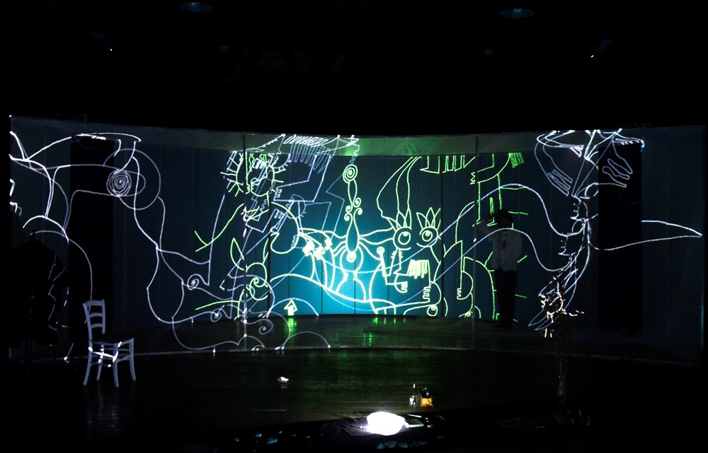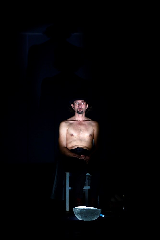 Predstava je neverbalna, dominantan medij kojim se priča priča je vizualan, spojen s glazbom. Tekst koji se koristi u audiozapisu jest kao da se sluša radiodrama, čitan iz romana bez intervencija (maestralna interpretacija Suzane Rupenović, uz pomoć Darija Filipovića, koji najavljuje kraj predstave citatom iz posljednjeg obračuna sa slikom koju mora uništiti).