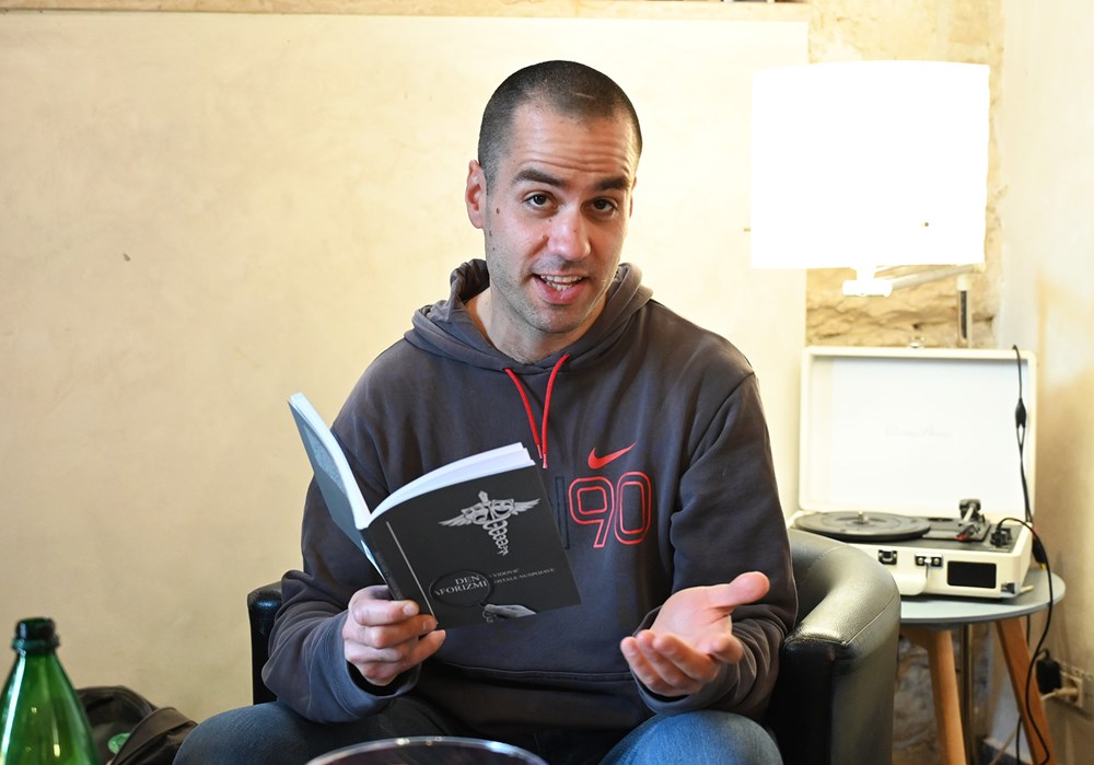 U vrlo interesantnom razgovoru sa Sabinom Aličić Butković govorio je o svojoj ljubavi prema haiku izričaju, humoreskama, aforizmima, svome romanu, te kako stalno mora imati bilježnicu gdje će sve zapisivati. Kazao je da karijeru nije započeo pisanjem aforizama, a priprema zbirku humorističnih priča u obliku pisama.