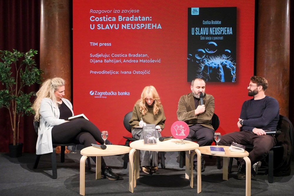 Costica Bradatan predstavio je svoju knjigu "U slavu neuspjeha" u četvrtak navečer u programu u kojemu su sudjelovali Dijana Bahtijari, Andrea Matošević i prevoditeljica Ivana Ostojčić. Potonja je bila i suprevoditeljica njegovih knjiga, za što je rekla da je bio iznimno zahtjevan i izazovan te obiman posao, a i sam naslov je bio intrigantno prevesti. Kolege Marko Maras i Hrvoje Gračanin radili su s njom na prijevodima tih knjiga.