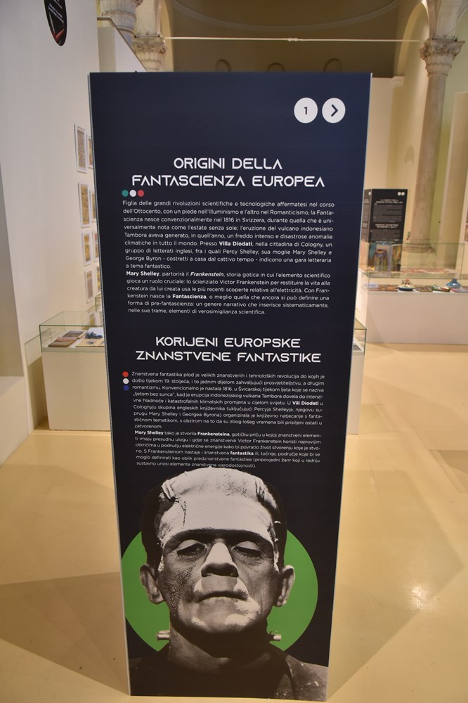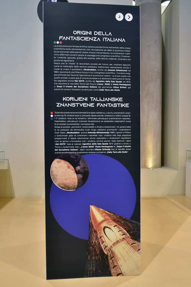 Davide Monopoli, jedan od autora izložbe uz Silviu Casolari, koji nas je proveo izložbenim prostorom, istaknuo je da su tri ključna trenutka ovoga postava - početak dvadesetog stoljeća, pedesete i sedamdesete godine prošloga stoljeća te suvremeno doba – koji pokazuju kako je talijanska znanstvena fantastika odigrala značajnu ulogu u konsolidaciji moderne fantastične imaginacije u međunarodnom kontekstu, zahvaljujući autorima kao što su Emilio Salgari, Primo Levi i Dino Buzzati