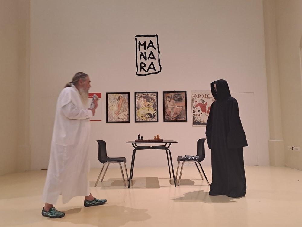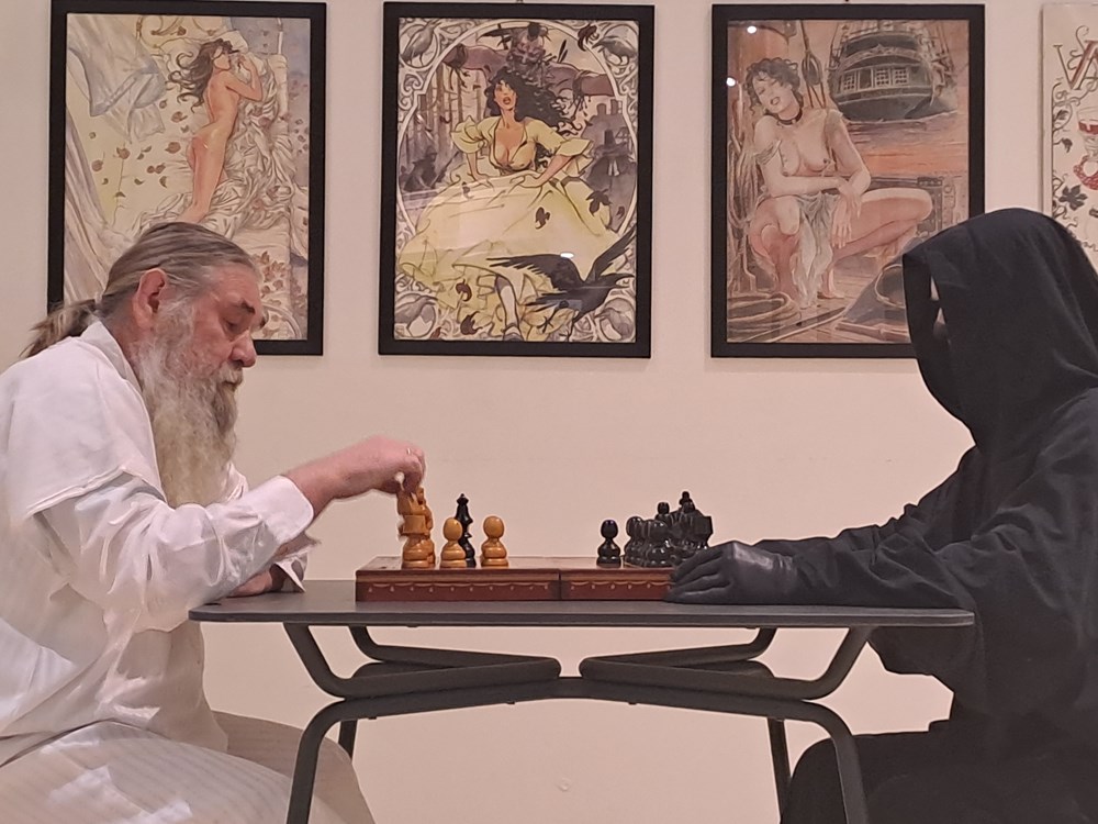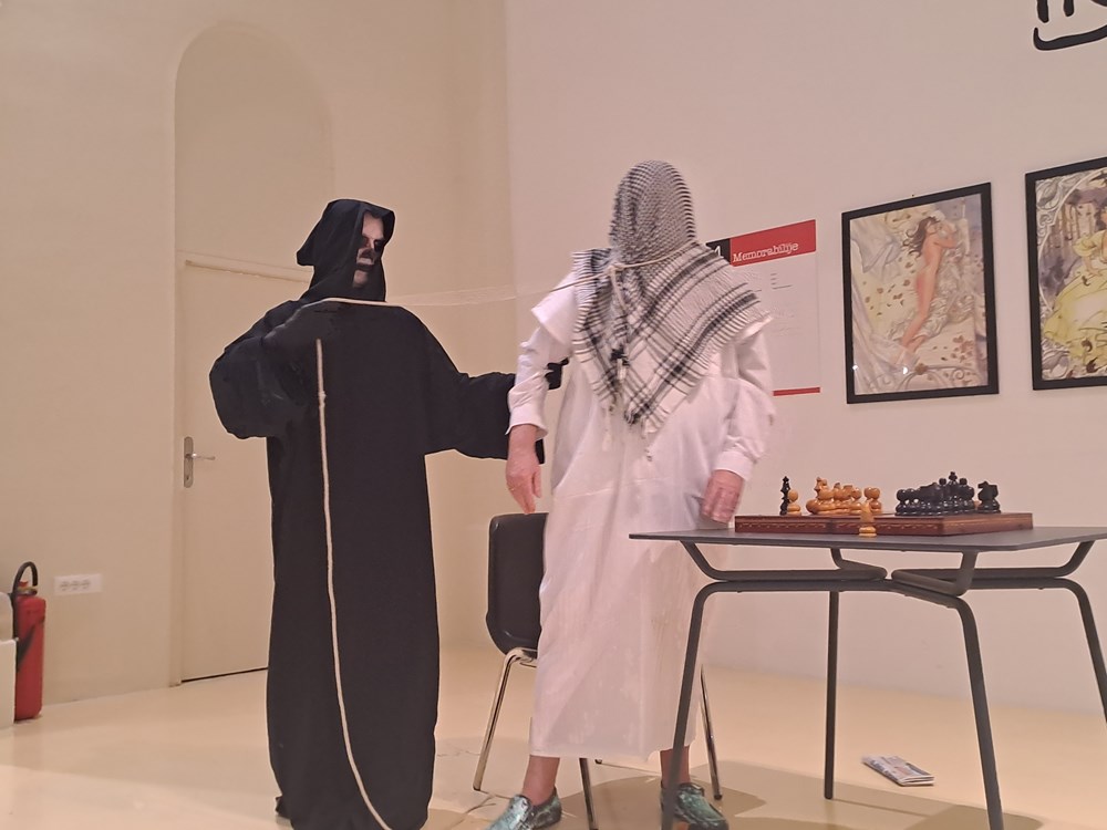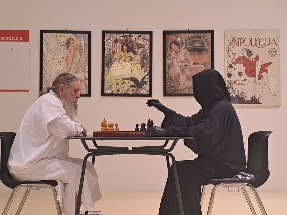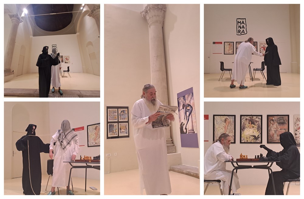 Performans, naziva »Šah-mat«, izveden je u tom sugestivnom prostoru, pod »budnim okom« stripovskih grafika velikog Mila Manare, u apsidi. Ondje je na stolu čekao set za šah, i dvije stolice. Scena je, kako su već u samoj najavi kazali, inspirirana famoznim »Sedmim pečatom«, filmom Ingmara Bergmana iz 1957. godine, kada se vitez, povratnik iz križarskih pohoda, u razdoblju velike kuge, Crne smrti, vraća u domovinu, a sama smrt, personificirana i vidljiva, pod crnim plaštem, poziva ga da zaigraju partiju šaha ne bi li vitez za sebe i svoju obitelj, ukoliko pobijedi, osigurao život – ukoliko izgubi, smrt ih ima pravo uzeti.