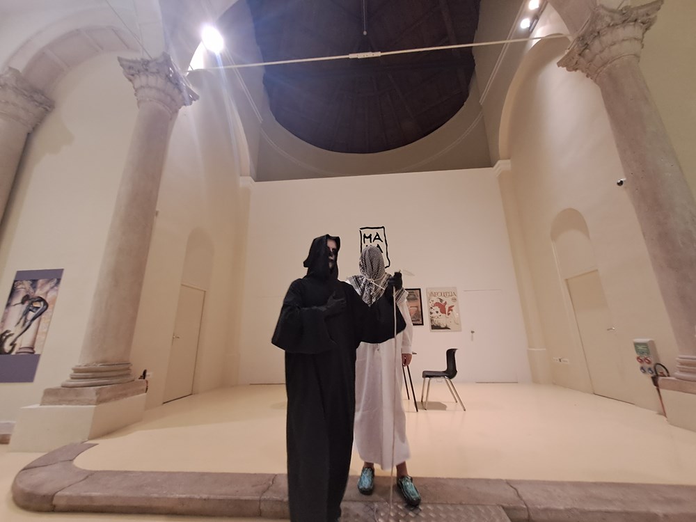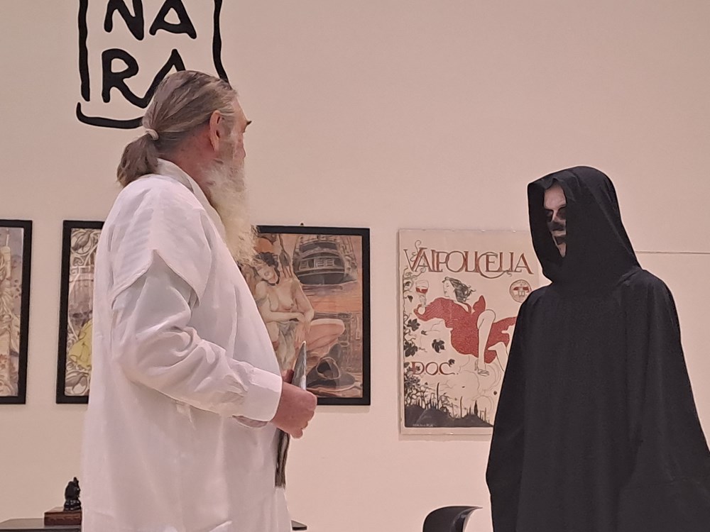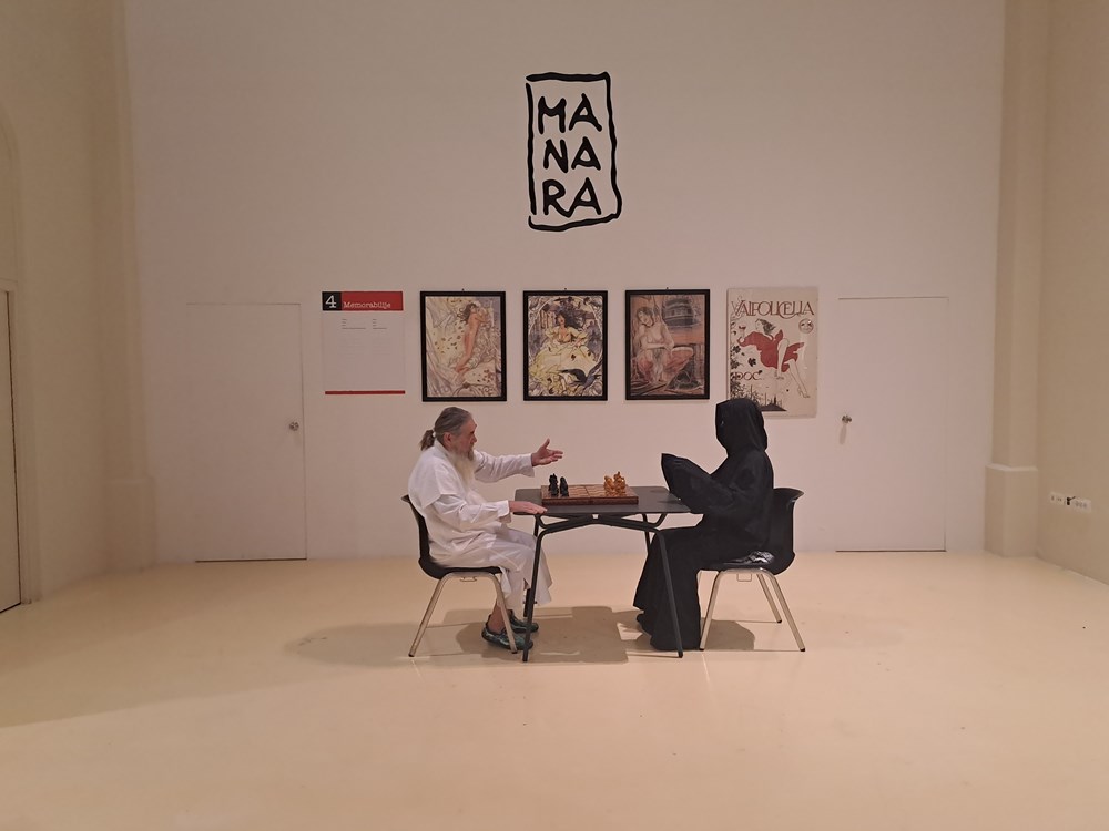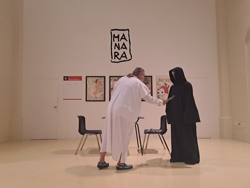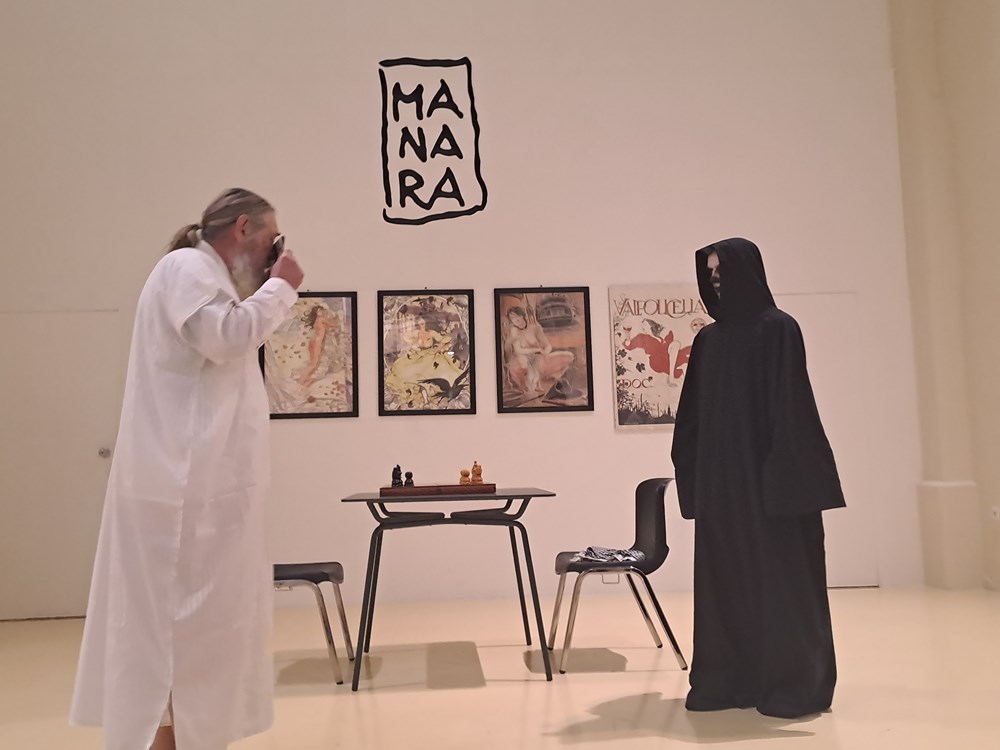 Performans, naziva »Šah-mat«, izveden je u tom sugestivnom prostoru, pod »budnim okom« stripovskih grafika velikog Mila Manare, u apsidi. Ondje je na stolu čekao set za šah, i dvije stolice. Scena je, kako su već u samoj najavi kazali, inspirirana famoznim »Sedmim pečatom«, filmom Ingmara Bergmana iz 1957. godine, kada se vitez, povratnik iz križarskih pohoda, u razdoblju velike kuge, Crne smrti, vraća u domovinu, a sama smrt, personificirana i vidljiva, pod crnim plaštem, poziva ga da zaigraju partiju šaha ne bi li vitez za sebe i svoju obitelj, ukoliko pobijedi, osigurao život – ukoliko izgubi, smrt ih ima pravo uzeti.