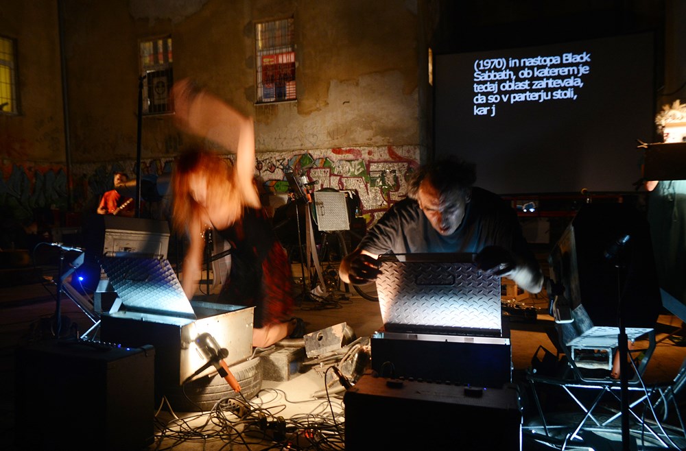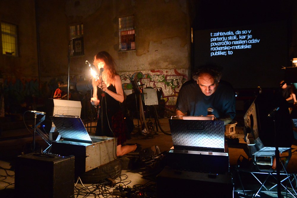Uz Indoša, Tanju Vrvilo, Damira Pricu Kafku i Andreju Košavić, kolektiv su činili i članovi nekad kultnog zagrebačkog dark noise benda SexA - gitarist Ivan Bilosnić Bic, basist Nino Pršuta i bubnjar Ratko Danilović. Kako je rečeno u najavi, šahtofonija za pokretanje "Sat pauk kiša Tivoli bewegen" rad je konkretne poezije za konkretnu glazbu-zvuk-glas prema vizualnoj pjesmi Josipa Stošića "Sat, pauk kiša", topografskoj pjesmi Matjaža Hanžeka "Hala Tivoli" i pjesmi o pokretljivosti, a otežanog čitanja Clausa Bremera "bewegen". Uz podršku videa Ivana Marušića, uhvaćeni poetski materijal dodatno je naseljen fragmentima iz knjige "Briljantnije od sunca" Kodwo Eshuna, i dokumentarističkim tekstovima (kronika, optužnica). Izvođenjem uho-analize fragmenata "Jazbine" i kratke priče o znanosti koja je mistificirala svijet, "Čigra" Franza Kafke govorilo se o golom uhu otvorenom za percepciju zvukovnih senzacija, prolazilo se kroz kolaž tivolijanskog rock krajolika, proizvodilo raznovrsne shizofonizacije zvuka, glasa i njihova izmještanja megafonije, šahtofonije...
