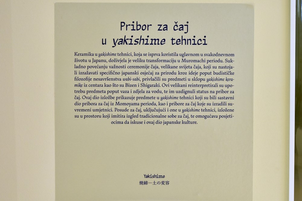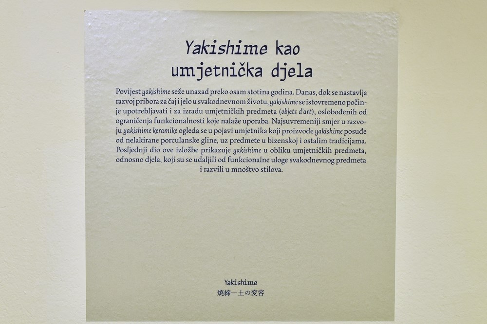 - Izložba je plod iznimno dobre suradnje, kao i organizacije, a posve je drukčija u odnosu na prethodnu, vrlo uspješnu, posvećenu japanskim lutkama. Predstavljena je u biti povijest Japana kroz keramiku, odnosno predstavljena je keramika od četvrtog stoljeća do dan-danas, a starije je razdoblje prikazano uz pomoć fotografskih ilustracija, da se približi na što bolji način, što razumljivije, dio ove bogate kulture iz te daleke zemlje. Izložba prikazuje tehniku izrade keramičkog posuđa - yakishime - koja podrazumijeva zagrijavanje nelakirane gline na jakoj vatri i visokim temperaturama, kazala je Gobić-Bravar.