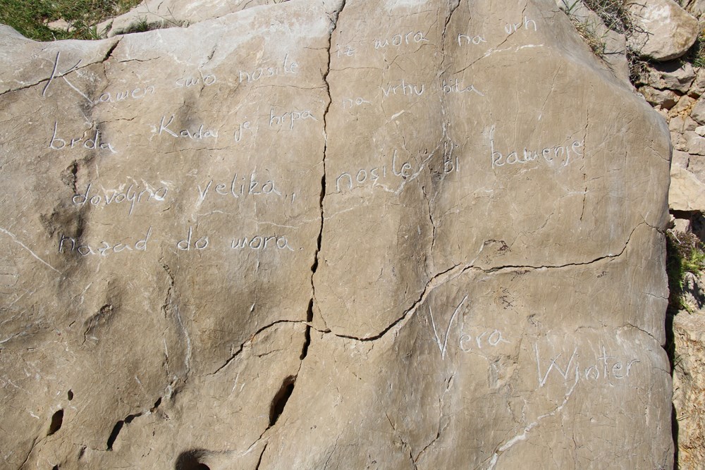 U kamenu na lokalitetu Golog otoka uklesano je i svjedočanstvo bivše logorašice Vere Winter ispisano rukopisom njezine unuke: „Kamen smo nosile iz mora na vrh brda. Kada je hrpa na vrhu bila dovoljno velika, nosile bi kamenje do mora“.