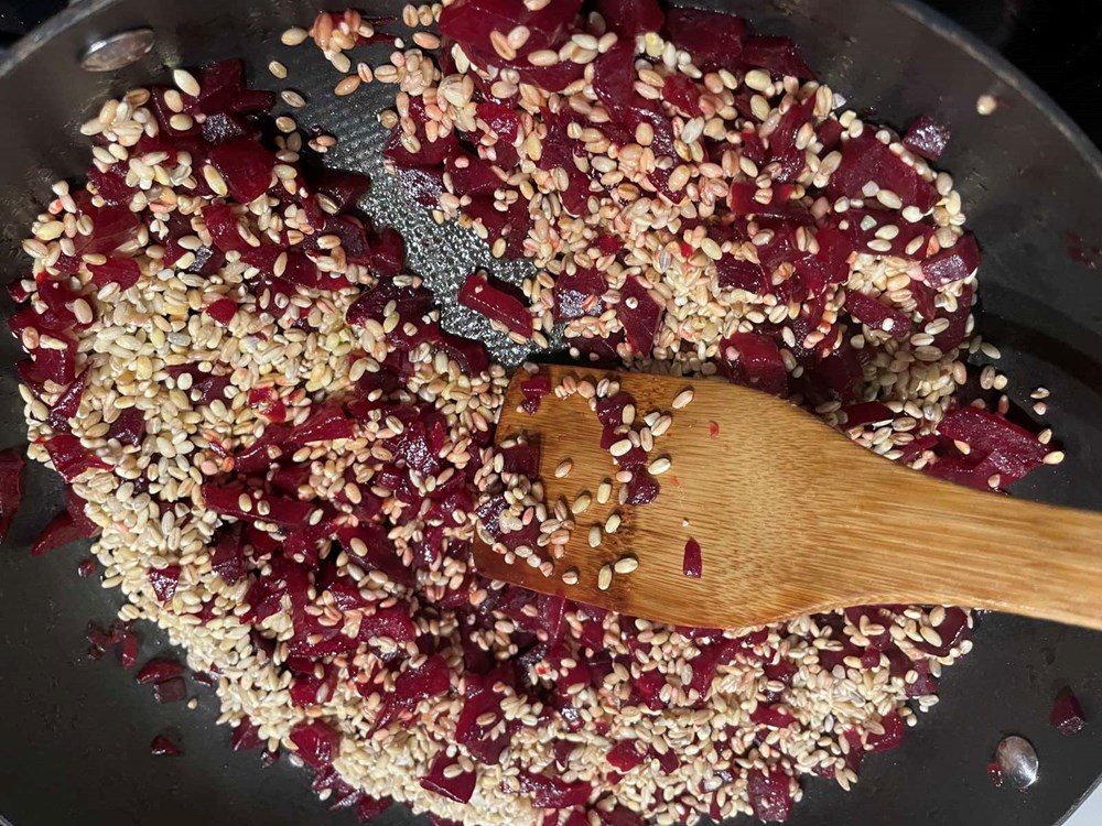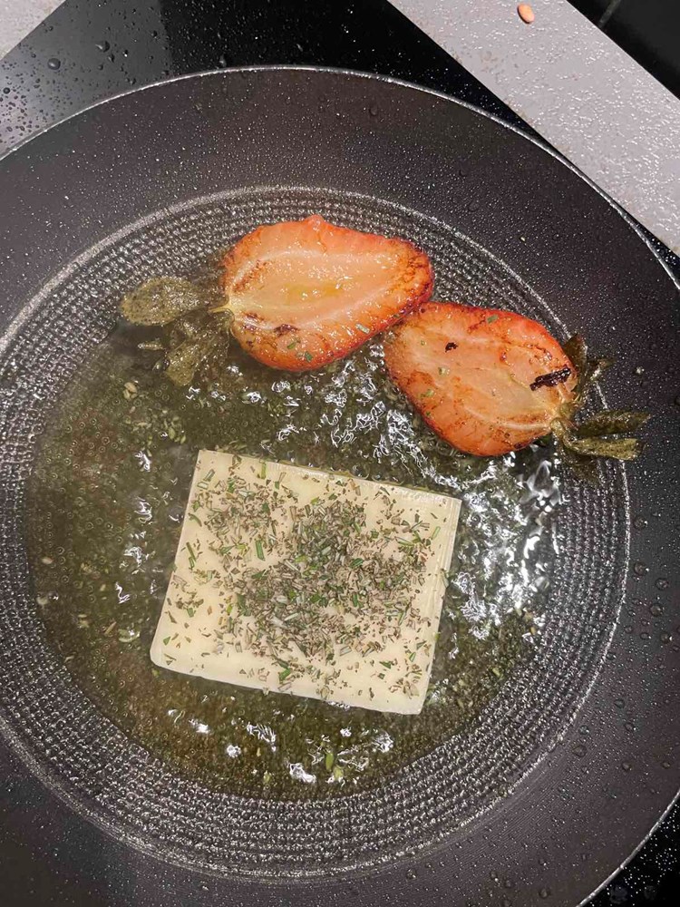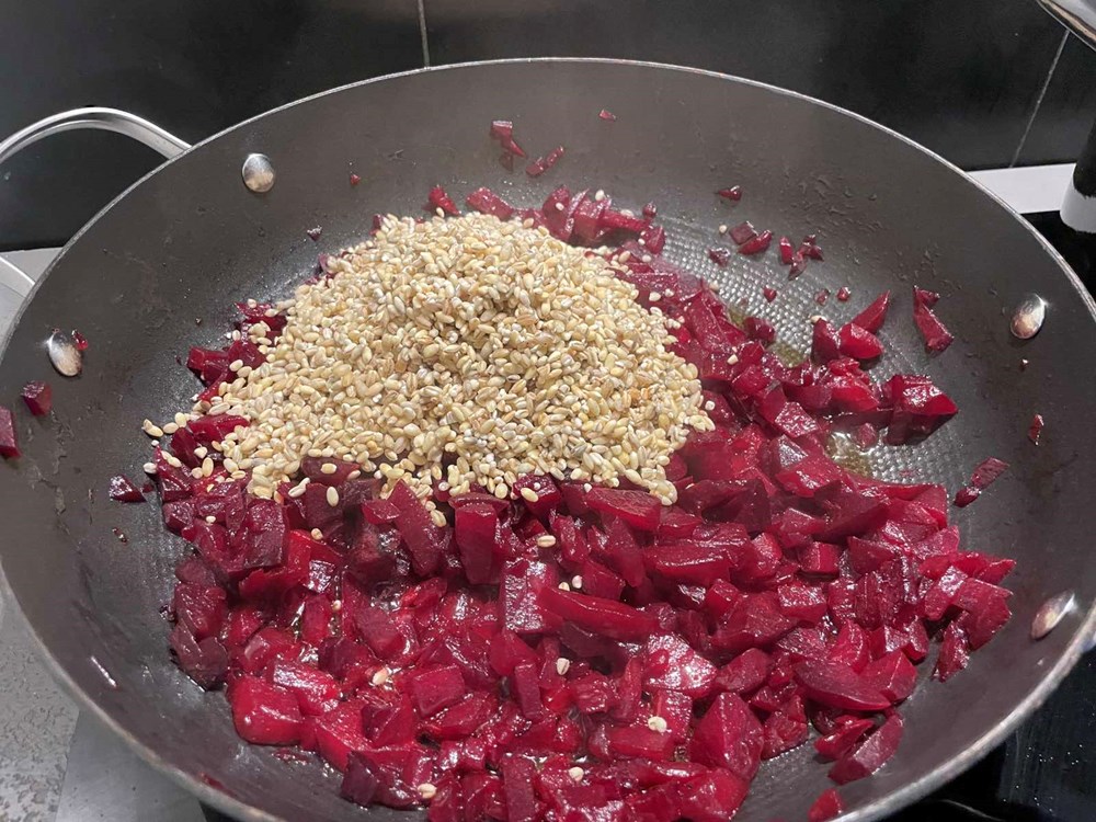 U veći lonac napunimo cca 2 l vode posolimo ju pa kad voda zakipi stavimo unutra pet sirovih cikli. Nakon cca. 30-tak minuta kuhanja ubacimo u vodu sa ciklom 7 grančica ružmarina pa sve to kuhamo još nekih deset minuta, te zatim maknemo s izvora topline. Ciklu izvadimo iz vode, ogulimo ju pa narežemo na male nepravilne komadiće veličine graha. Kažem nepravilne komadiće jer će struktura jela zanimljivije izgledati nego da smo narezali na iste kockice ili samljeli štapnim mikserom u nekakvu kašicu. Svaki dan je drugačiji kao i svaka vaša misao nije ista, pa tako bi trebalo biti i u kuharstvu … nejednaki komadići …. Ok, idemo dalje. Nakon što smo izrezali ciklu koji smo kuhali u ružmarinu na nejednake komadiće, a vodu u kojoj se kuhala sa ružmarinom ostavili smo kao temeljac za podlijevanje, u poludubokoj tavi na zagrijano maslinovo ulje bacimo komadiće cikle i pržimo ih cca. 5 minuta. Nakon pet minuta u tavu ubacimo prstohvat cvijeta morske soli i pet šaka ječma. Ječam i ciklu lagano miješamo na srednje jakoj vatri 2 do 3 minute pa zatim počnemo s podlijevanjem. Uz poluduboku tavu smjestimo naš lonac s temeljcem od cikle i ružmarina u kojem smo kuhali ciklu. Svakih cca 7 minuta dodamo po kaciolu našeg temeljca, ne previše tekučine čisto da smijesa ne bude suha. Konstantno i lagano miješajte na taj če način baš kao iz riže kad pripremamo rižot škrob izlaziti iz ječma. Nakon nekih cca 25 minuta konstantnog miješanja i povremenog podlijevanja temeljcem, umjesto temeljca dodamo 1,5 dcl kozje sirutke pa nastavimo lagano miješati još nekih 5 minuta. Nakon 5 minuta toplinu smanjimo na minimum pa dodamo cvijetove ljubičice koji su preko noći odstajali u maslinovom ulju kao i jednu jušnu žlicu tog aromatiziranog maslinovog ulja. Miješamo lagano na maloj temperaturi još cca 2 minute pa maknemo s izvora topline i pustimo jelo da odstoji u tavi nekih 7 minuta. U međuvremenu u malu plitku tavu na zagrijano maslinovo ulje stavimo pržiti jagode razrezane na pola. Pržimo cca 50-tak sekundi na razrezanoj ravnoj strani, smanjimo toplinu na minimum pa okrenemo na drugu i stavimo ih uz sam rub tave ta se prže.Zatim na sredinu tave stavimo deblju fetu gauda sira i po njoj sitno nasjeckane iglice ružmarina koje smo oštrim nožem na dasci za rezanje usitnili i pržimo tako dok se feta sira ne počne topiti pa na nju smjestimo polovice prženih jagoda i maknemo s izvora topline.
