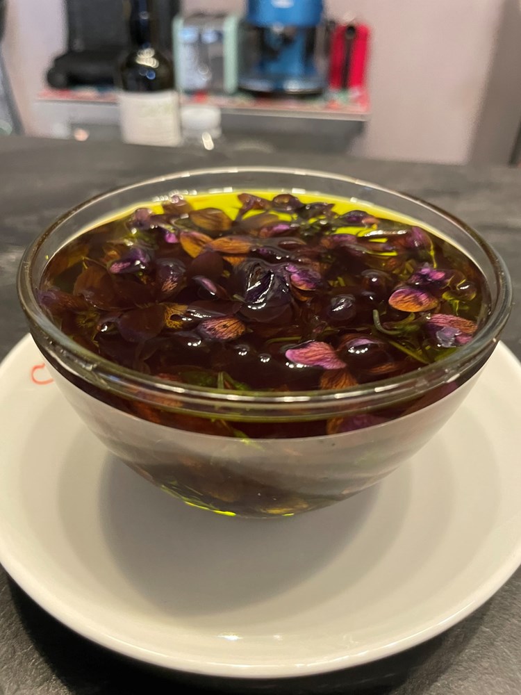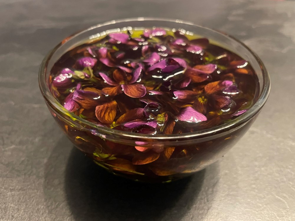 Naberemo, kupimo ili nabavimo nekako pomoću trikova stručak ljubičica, da ih ima cca 20-ak cvjetova. Te cvjetove odvojimo od peteljke i stavimo ih u zdjelicu s maslinovim uljem da budu potopljeni u ulju. Poklopimo zdjelicu tanjurićem i ostavimo ju preko noći da odstoji. Što će se dogoditi: cvijet ljubičice otpustit će u ulje svoju nježnu aromu koja je vrlo slična mirisu ljubičice.