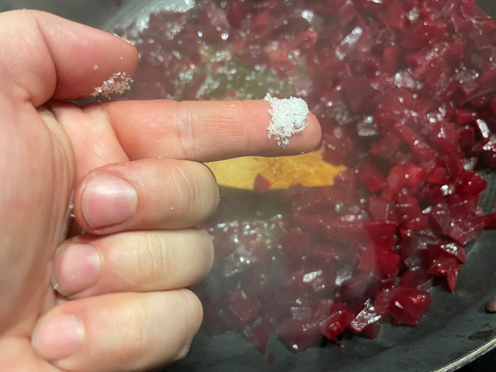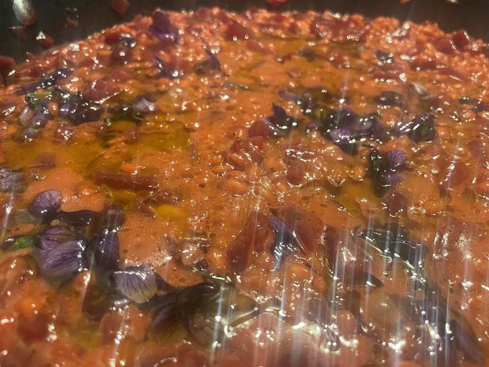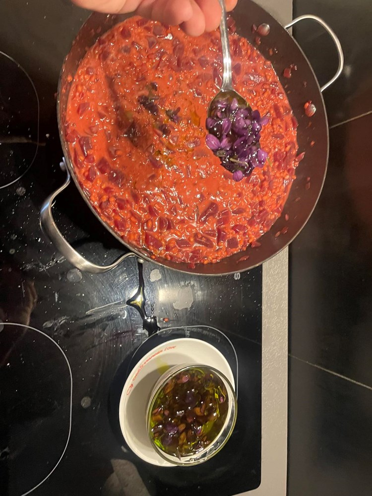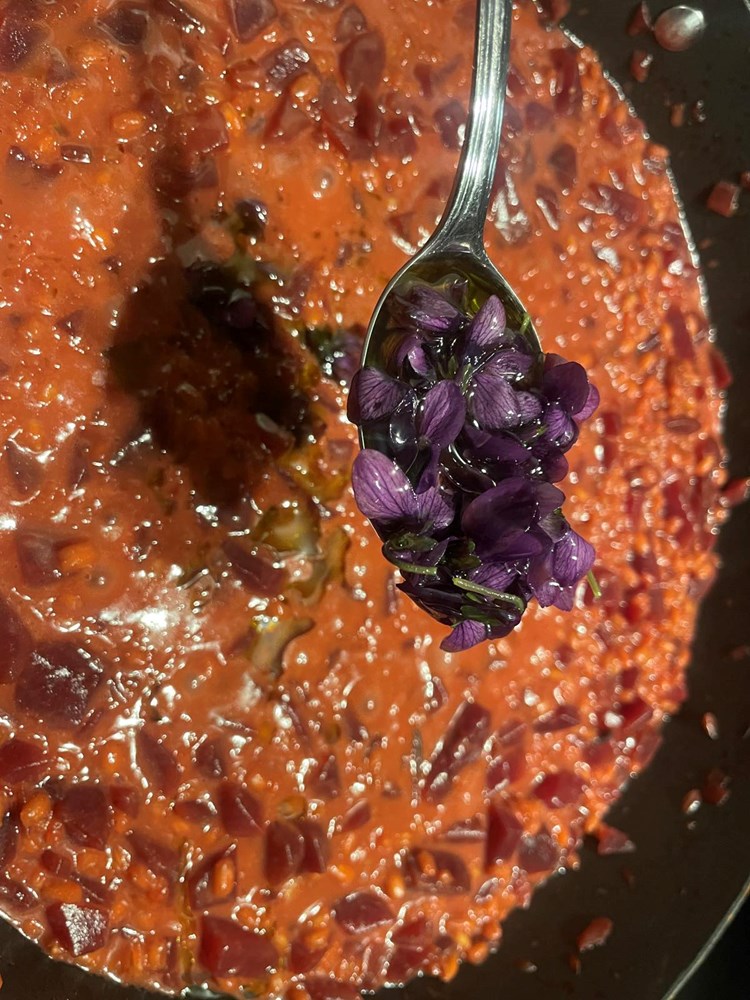 Idućeg jutra jurim u svojoj "oldschool" Alfi prema industrijskoj zoni u Galižani do svojeg frenda, mudrijeg i iskusnijeg chefa Modrušana. Sjedimo kod njega u uredu i prvo, baš kao i svi profesionalni chefovi, psujemo i proklinjemo na glas sve ono što nam se u kuhinjama i ovome svijetu ne sviđa. Zatim slijedi ispijanje espressa… dok smo pili caffe govorim mu za svoj plan izrade jela s ljubičicama, ječmom i ciklom i budući da je iskusniji i mudriji chef od mene sa znatno više utakmica u nogama pitam ga za savjet - koju bih stvar mogao dodati u to svoje jelo da podigne vrijednost cijeloj priči… on srkne još gut - dva svojeg espressa, povuče dim cigarete pa mi kroz dim, baš kao u nekim crno bijelim gangsterskim filmovima odgovara: "dodaj još malo sirutke od koze, ona ti se savršeno uklapa sa ciklom"… dakle… uz stisak ruke "big chefu" kresnem svoj auto i VROOOAMM! Zaustavljam se na gradskoj tržnici uzimam kozju sirutku s obližnjeg štanda, pa onda opet VROOOAMM! Nazad u svoju kuhinju… 3,2,1…. Yhaaaaa! …. i danas kuham!