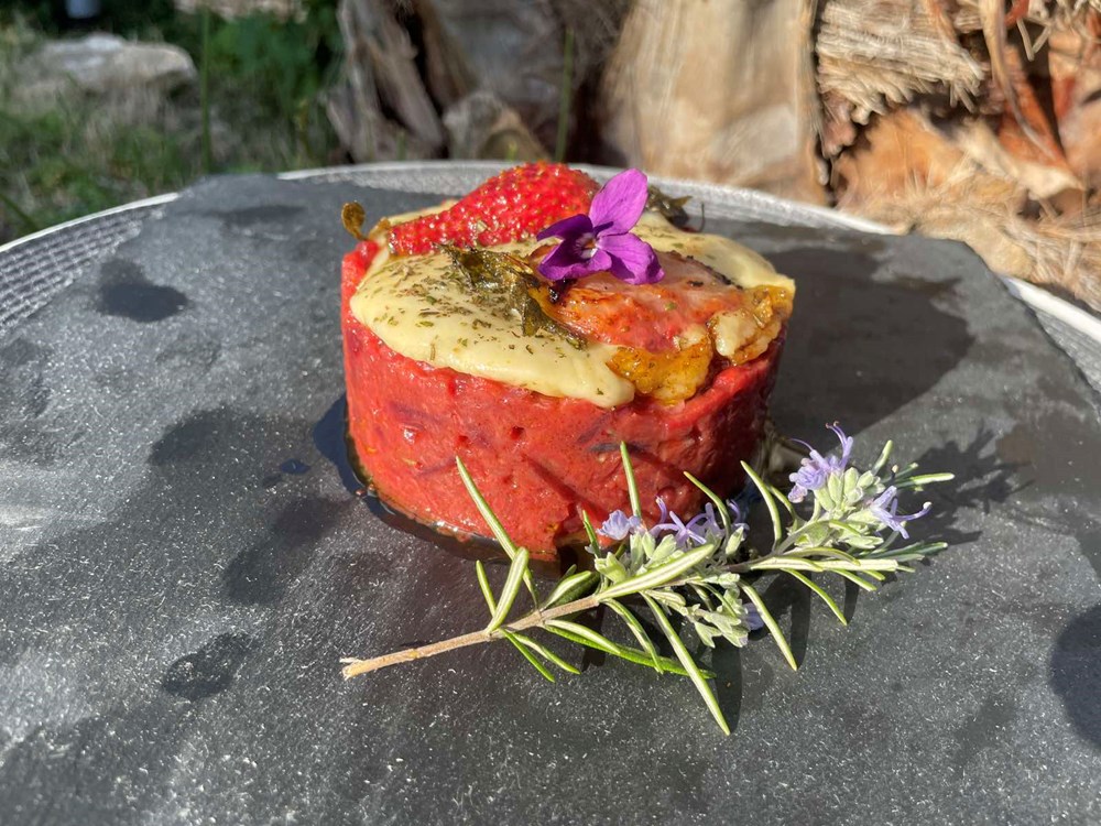 Slaganje tanjura: Nekakvim kalupom ili velikom servirnom žlicom na tanjur stavimo ječam sa ciklom i ljubičicama kojeg smo skuhali na sam vrh našeg jela stavimo topljenu gaudu s ružmarinom i polovicom pržene jagode. Sve ovo možemo ukrasiti još sa sviežim cvijetom ljubičice ili grančicom ružmarina… dragi moji ljudi … uživajte u fuziji eteričnost okusa koji se isprepliću dok konzumirate ovo jelo… vaš Outlaw.