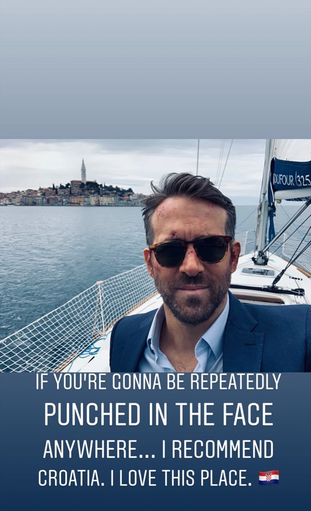 Dan ranije, sa svojim je pratiteljima na profilu podijelio slike izranjavanog lica (za potrebe filma) riječima "Ako će vas negdje uzastopce udarati u lice...preporučujem Hrvatsku. Volim ovo mjesto", našalio se Reynolds.