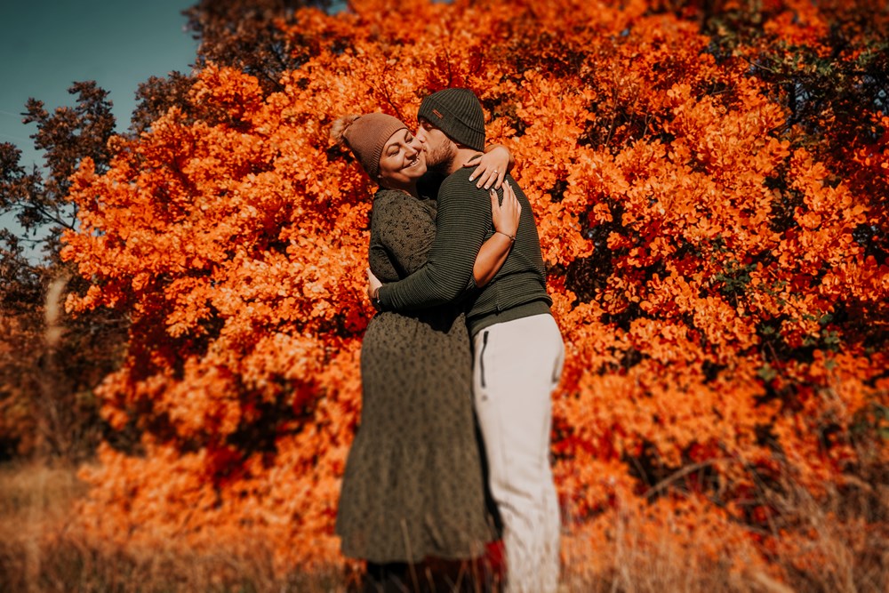 Znate i sami da je jesen kao stvorena za prekrasne fotografije. Ugledala sam grm prepun jesenskih boja i odlučila da ga moramo iskoristiti za jedan "couple samoportret". Uz "kamen stativ". (fotografija 3)