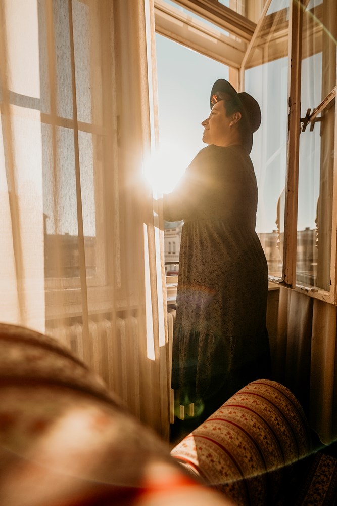 Drugi primjer samoportreta je s naglaskom na ambijent. Željela sam uhvatiti sunce, prozor koji gleda na glavni trg u Osijeku, sreću i opuštenost u trenutku. Malo sam pomaknula namještaj, fotoaparat stavila na naslonjač koji je bio u hotelu (vidi se čak u donjem kutu) i namjestila samookidač da stignem otrčati do prozora i napraviti takvu fotografiju. Više pokušaja, uz malo upornosti. (fotografija 2)