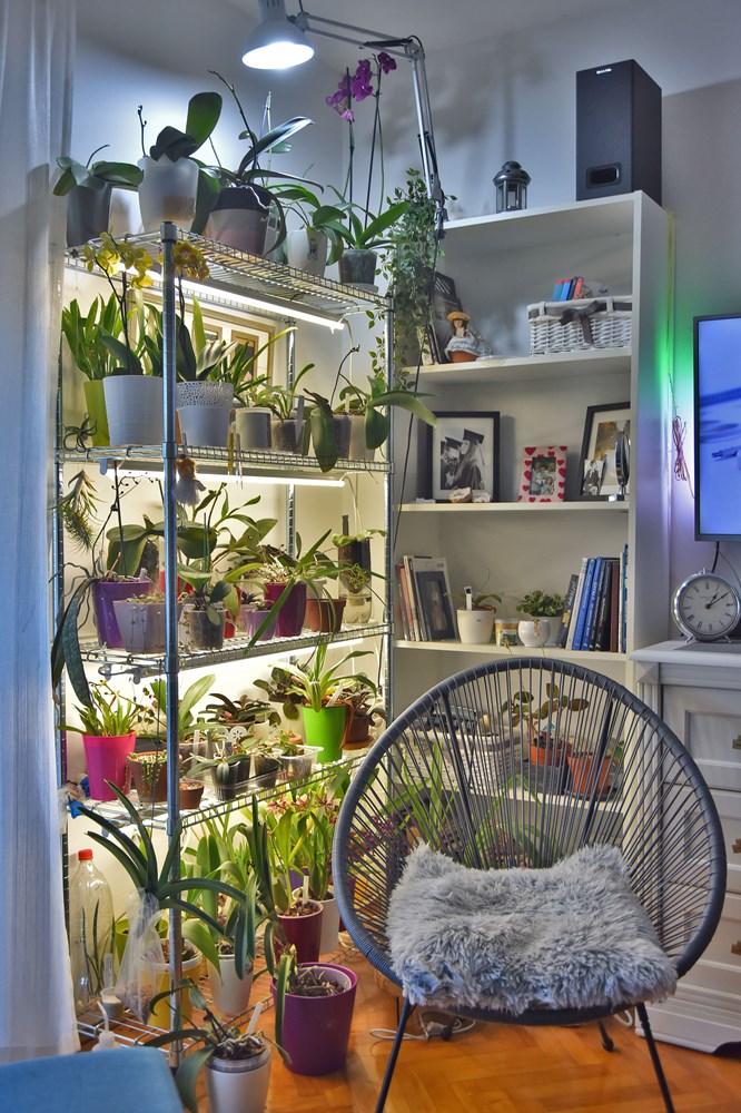 - Ne možemo se o biljkama brinuti 24 sata na dan, već se o njima brinemo dok smo kod kuće, a to je nekih pola dana, odnosno 12 sati, priča Mirjana u svom kutku koji je također sama osmislila - police, svjetlost. Sve je u znaku orhideje, pa čak i majica koju nosi.