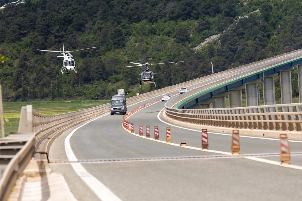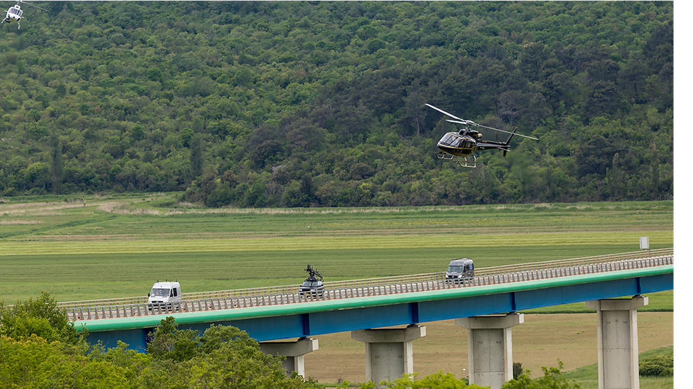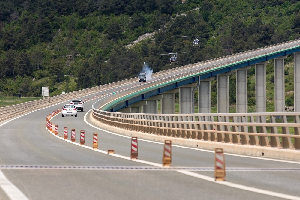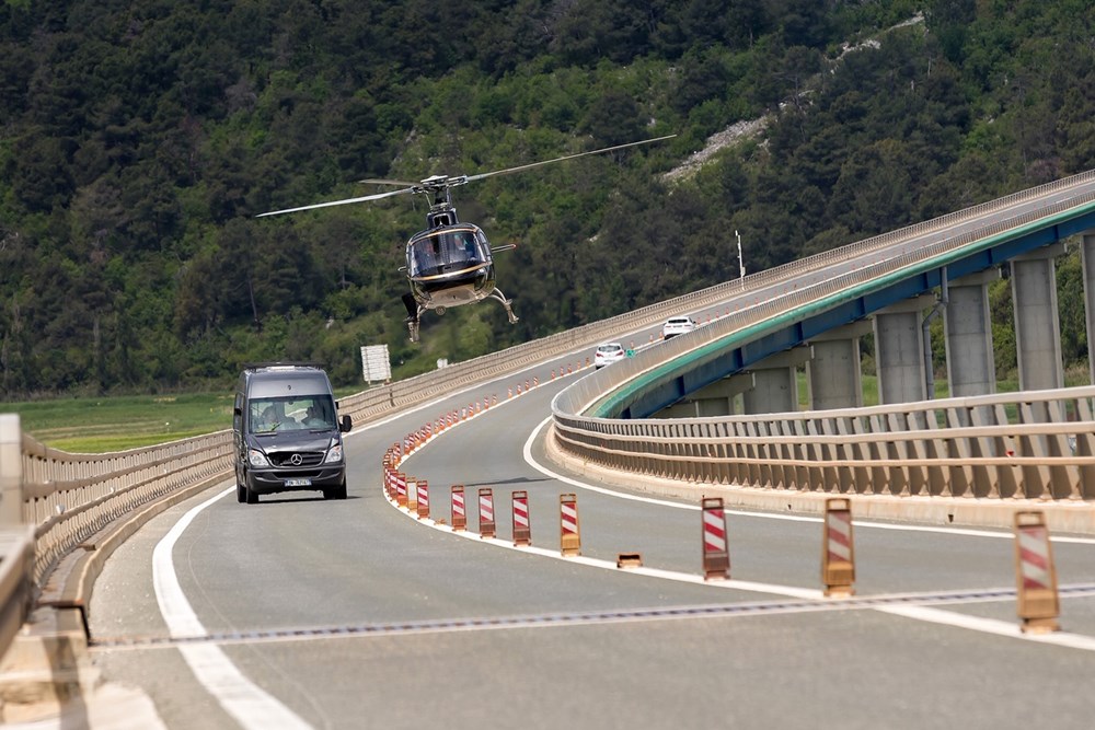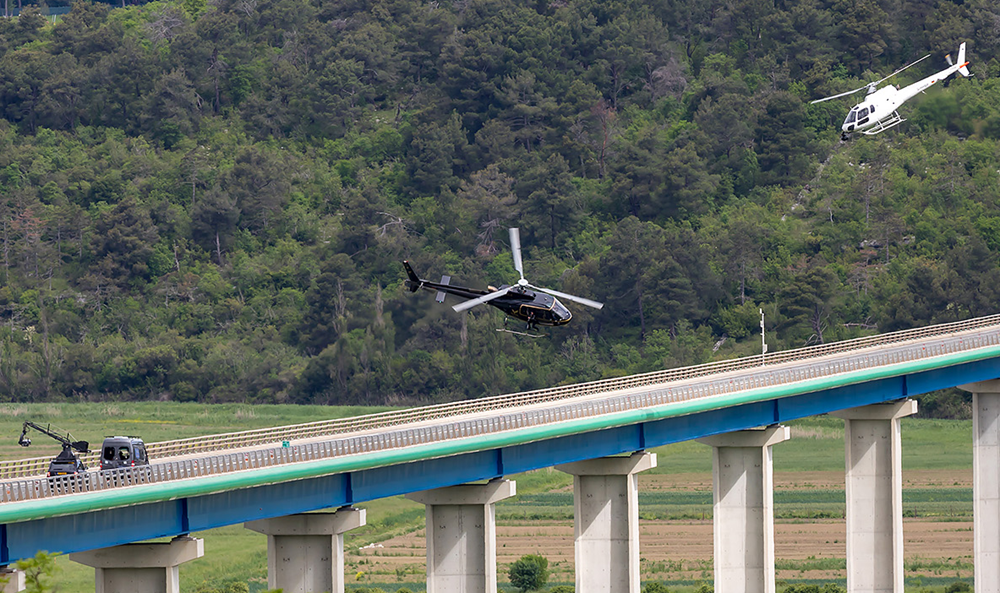 Scena akcijske jurnjave završava na mostu Mirna kada se u kadru pojavljuje helikopter koji prelijeće ispod i iznad mosta.
